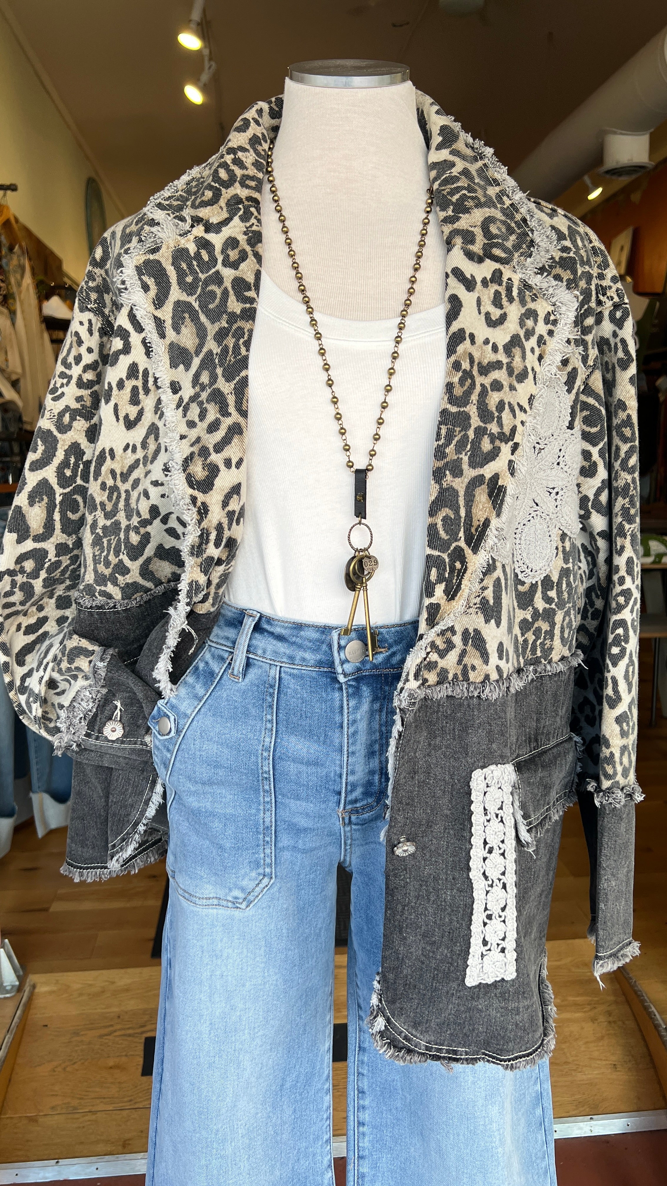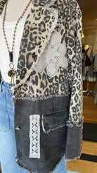 Features: Leopard print, lace floral details, washed black twill hem, raw-edge seams, silver flower buttons, flap pockets