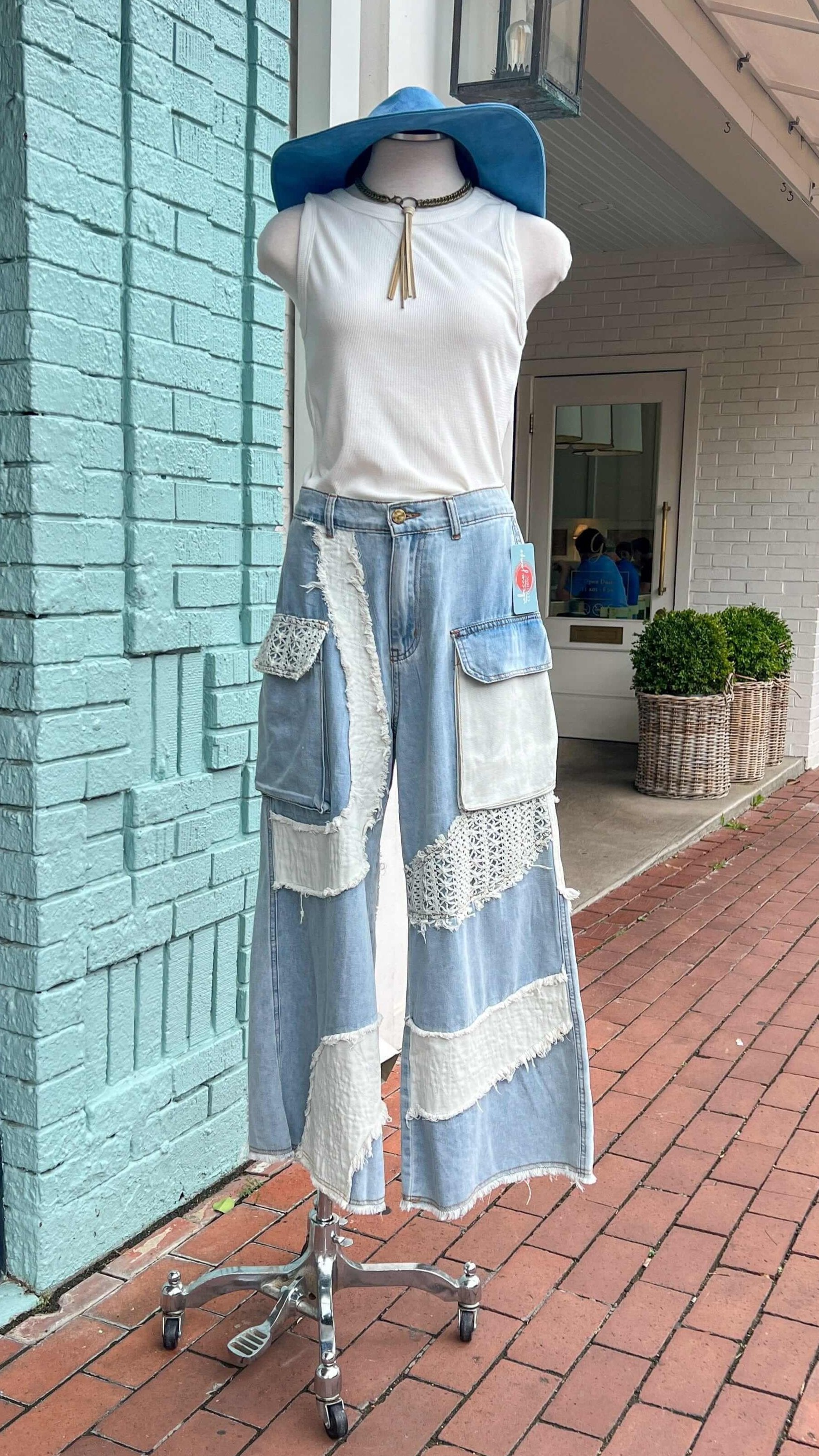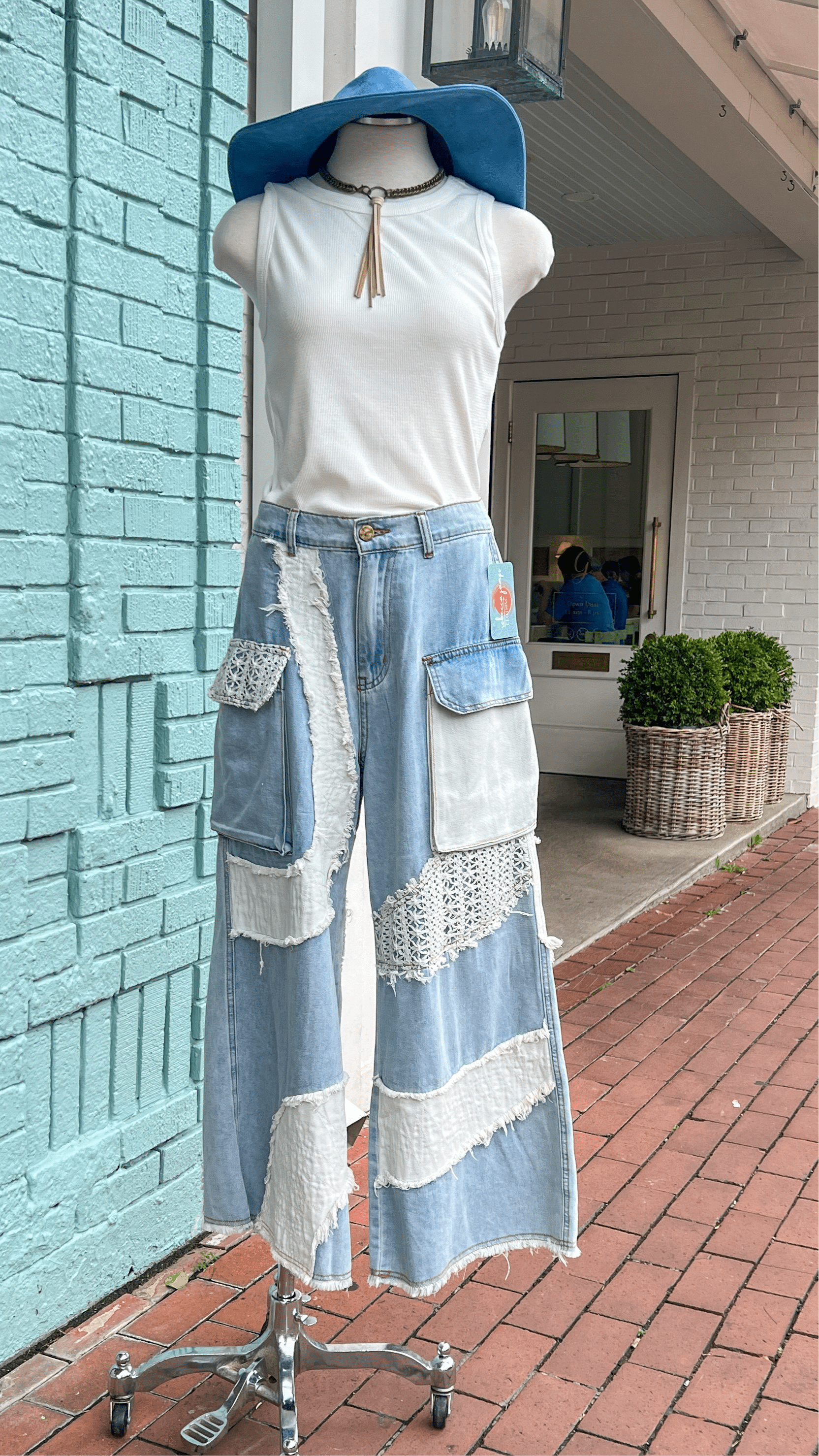Allow your personal style to shine with the unique combination of wavy lace contrast and textured fabrics on the wide leg cargo jeans. These pants are perfect for the fashion-forward individual who loves to stand out in a playful and quirky way. (Be the envy of all your friends!) The denim is light to medium weight.