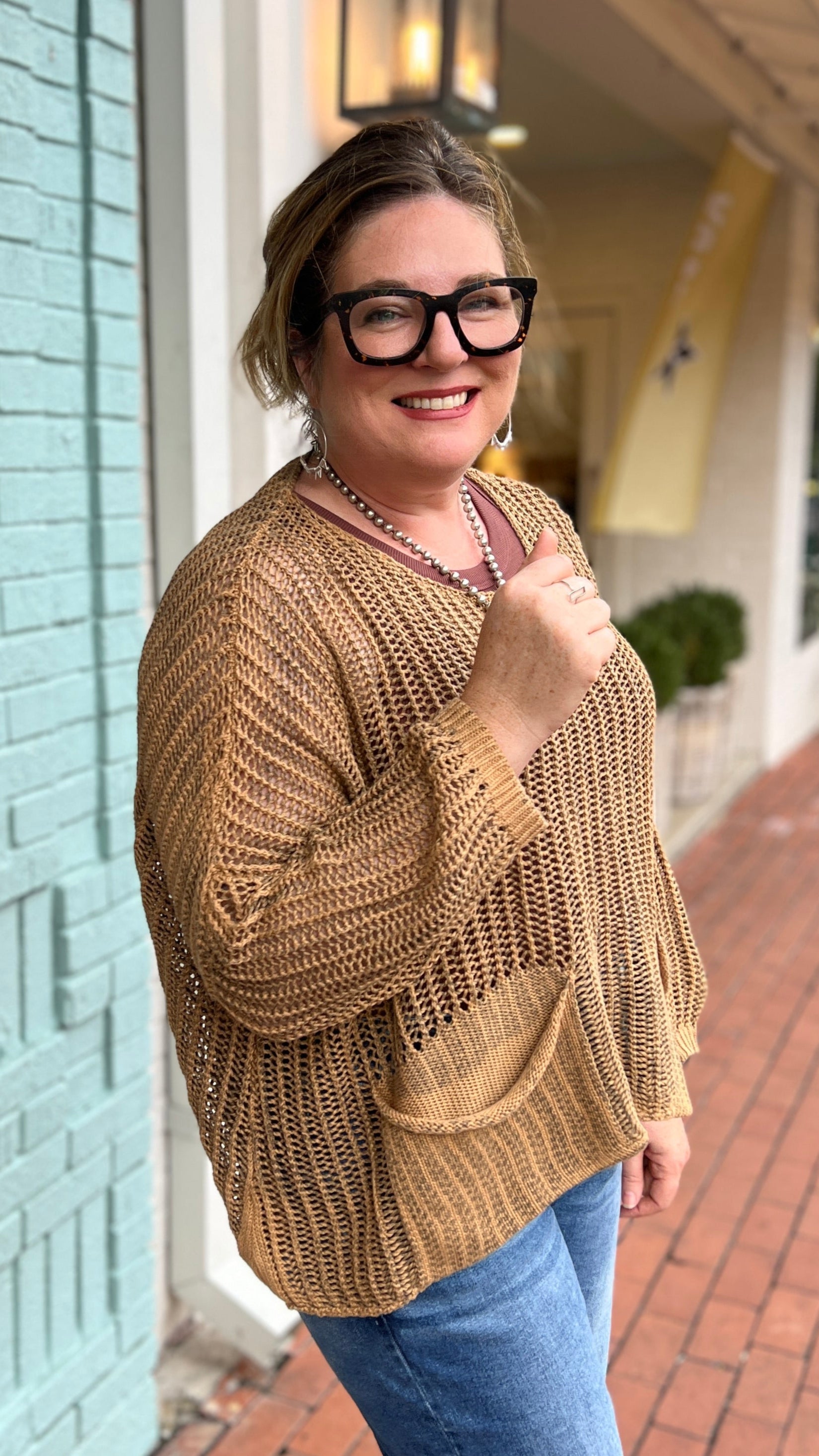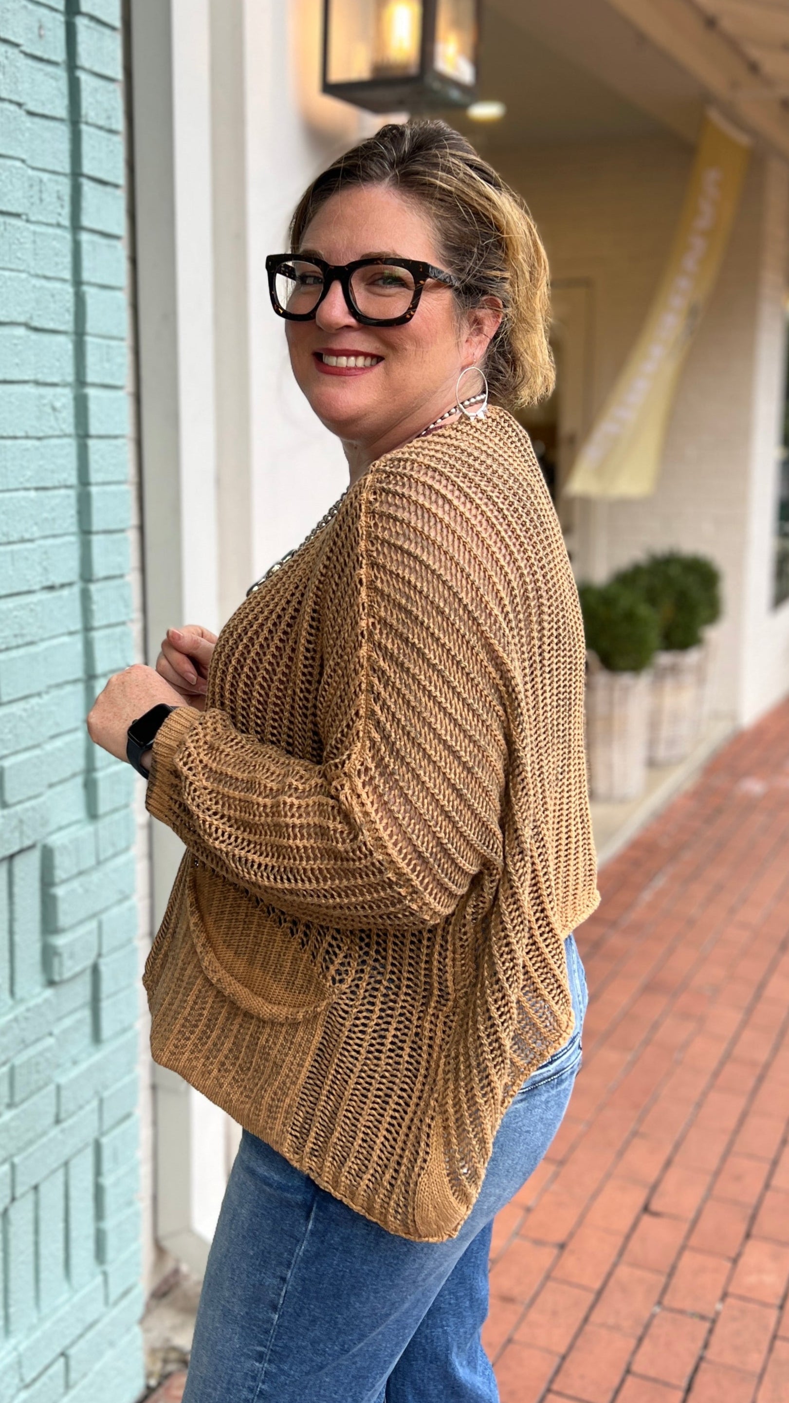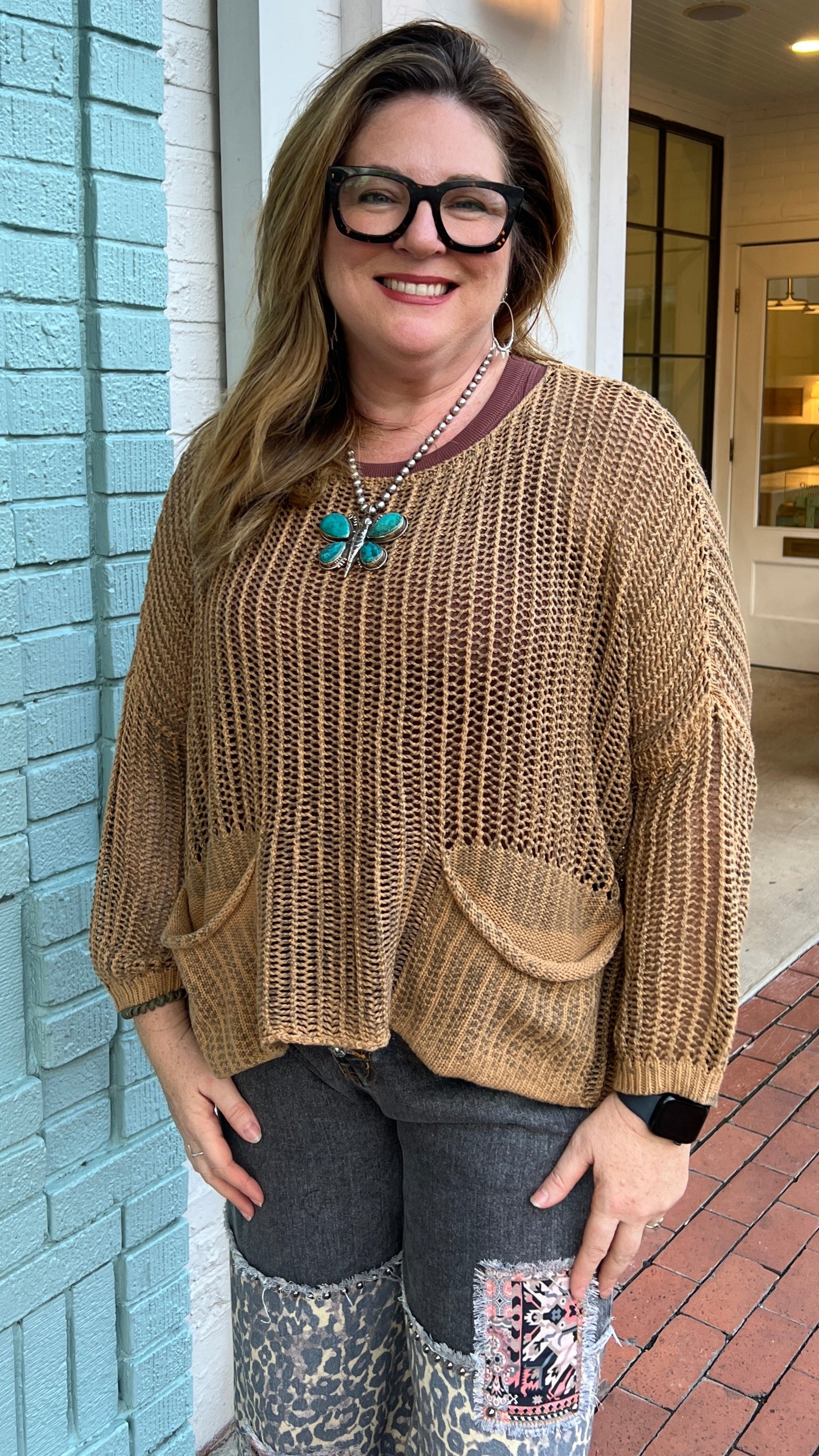 Camel Open Weave Sleeveless Cowl Neck Sweater