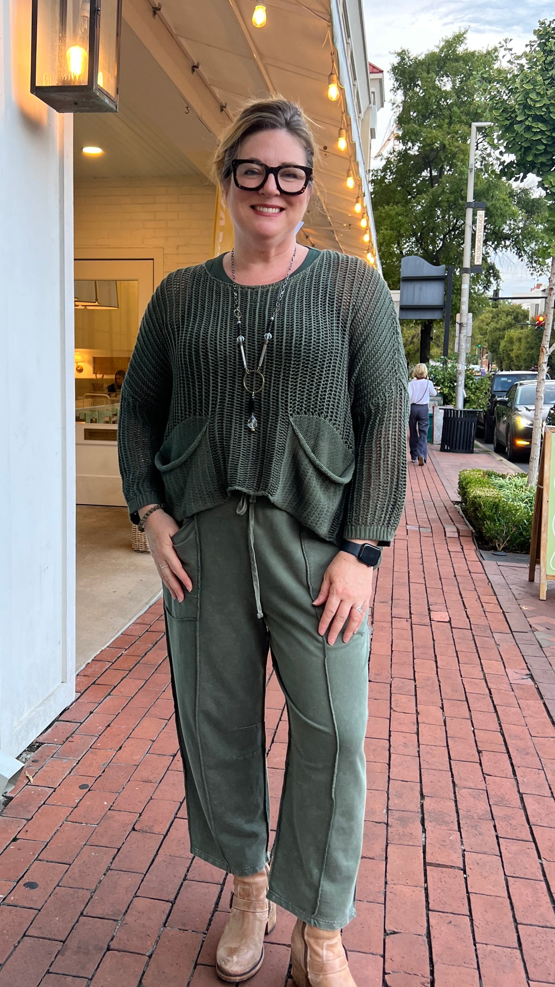 Faded Olive Patchwork Heart Terry Knit Pullover