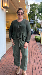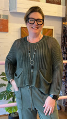A customer favorite, now in a rich olive green shade, this Italian-made cotton sweater is the versatile piece your wardrobe has been waiting for. With its oversized, draped fit and front pockets, it offers effortless style and comfort you’ll reach for year-round. The open weave knit makes it breathable and easy to layer, while the dark green tone pairs beautifully with our new Forest Green tank top and Pine Green knit barrel pants. Perfect for holiday gatherings, casual weekends, or layering into your everyday wardrobe, this sweater is as functional as it is flattering.
