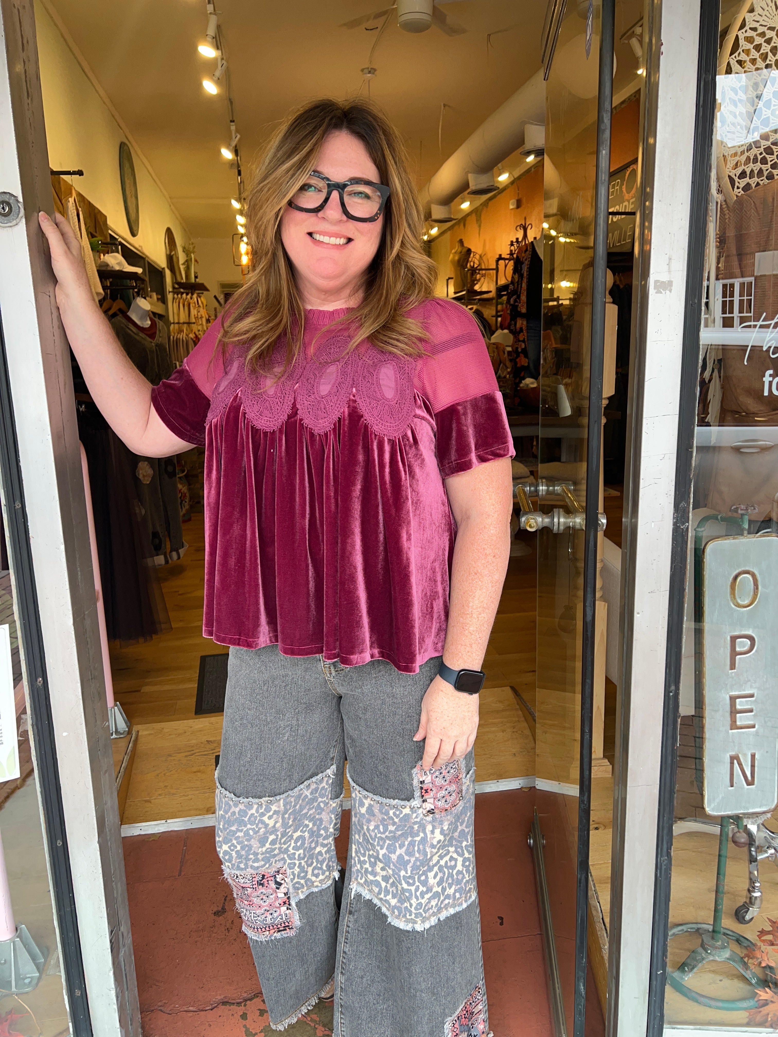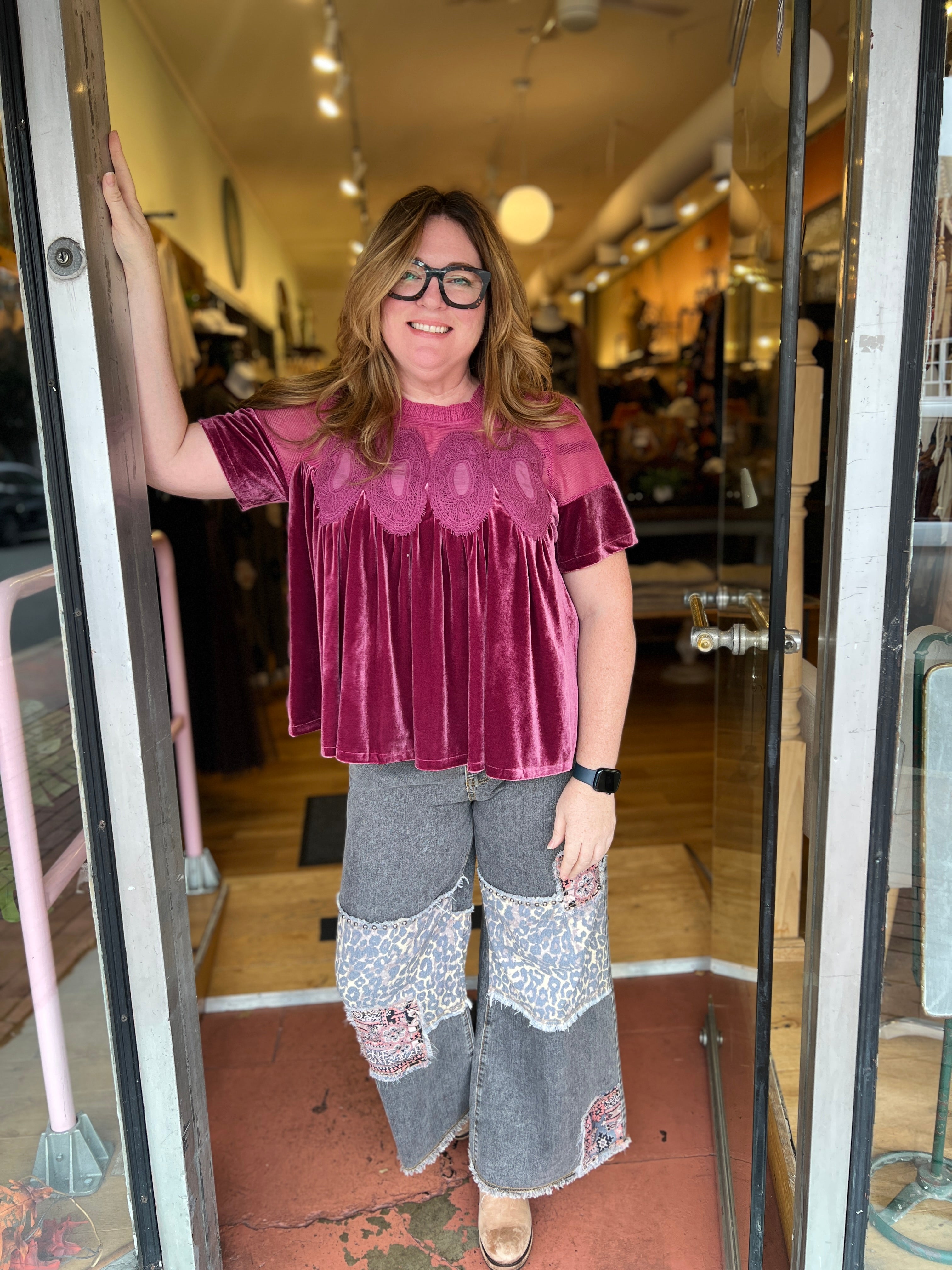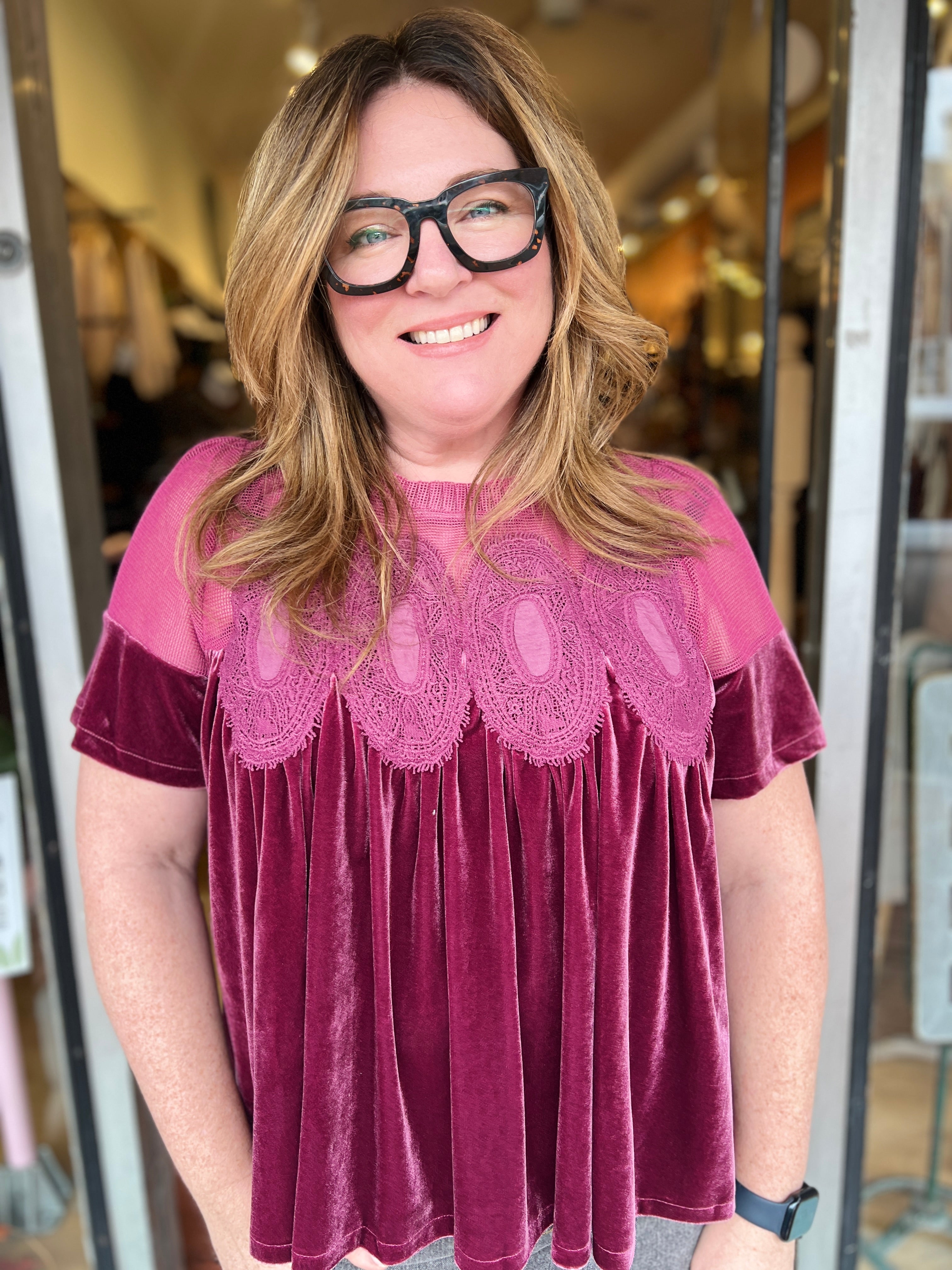 The Berry Lace Detail Velvet Babydoll Top is everything you want in a holiday piece — soft, feminine, and full of festive charm. Crafted from rich berry velvet with delicate lace detailing at the neckline and sleeves, it’s the perfect mix of romantic and relaxed.