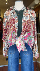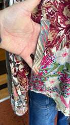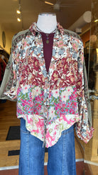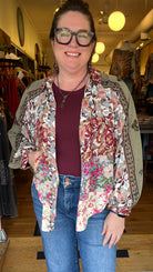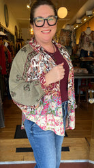 The Bishop Sleeve Rounded Hem Floral Top is a flowy, statement blouse designed for effortless boho style. With wide billowing sleeves embroidered from shoulder to cuff, this top brings elegance and artistry to your everyday wardrobe. The button-down front, rounded hem, and mixed floral print in shades of olive and burgundy make it a versatile piece you’ll reach for all season. Side pockets add a casual, functional twist, while the oversized fit creates an easy, draped silhouette. Pair it with our Forest Green tank and Pine Green knit barrel pants for a layered fall look, or wear it with jeans for a chic, relaxed vibe.