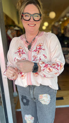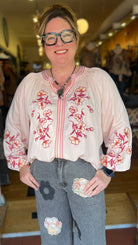 This blush embroidered top is the perfect mix of comfort and elegance. With its relaxed, oversized fit and smocked neckline, it drapes beautifully while still feeling easy to wear. The notched V-neckline and floral embroidery give it a feminine, elevated look, while the elastic cuffs keep the sleeves comfortably in place. Perfect for work, church, or date night, this woven rayon top is versatile enough to dress up or wear casually with jeans. Fun paired with our POL Flower Patch Striaght Leg Jeans!