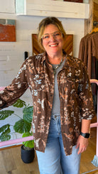 Style: Boho chic button-down blouse with chocolate brown base, floral accents in blue and white, and a lace back detail