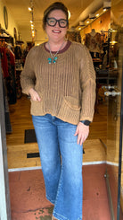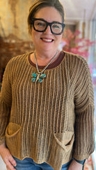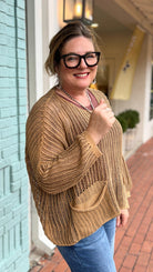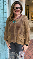 A boutique favorite now available in a rich mineral-washed camel, this Italian-made cotton sweater is the perfect layering piece for fall. The oversized draped fit with front pockets makes it as cozy as it is stylish, while the open weave knit keeps it breathable and versatile year-round. This shade of camel pairs beautifully with our Espresso Ribbed Tank Top and Black Straight Leg Jeans with Leopard Patches for a chic, earthy look. Whether you’re dressing for a casual weekend, a coffee date, or layering for cooler evenings, this sweater is the kind of effortless staple you’ll reach for again and again.