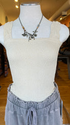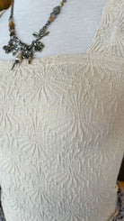 The Cream Square Neck Textured Tank is that perfect go-with-everything piece you’ll reach for all year long. Made from an ultra-soft, super-stretchy jacquard knit, it has a flattering square neckline and thick straps that make it easy to wear alone or layered under jackets, kimonos, or cardigans.