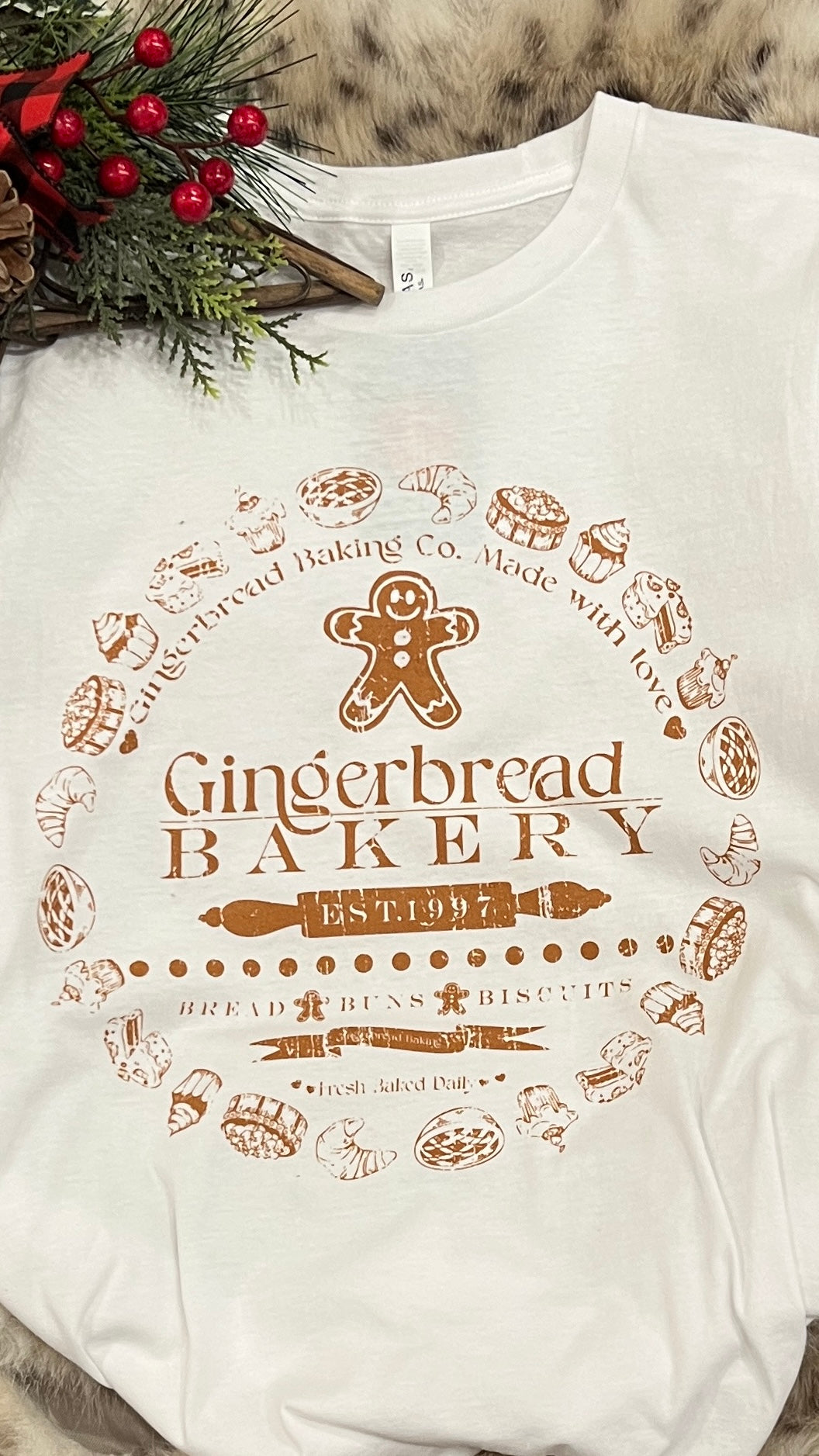 The Gingerbread Man Bakery Graphic Tee is the sweetest way to add a little holiday cheer to your wardrobe. Printed on a soft short sleeve white Bella & Canvas tee, this adorable bakery-style graphic features warm, neutral tones that make it easy to pair with any outfit all season long.