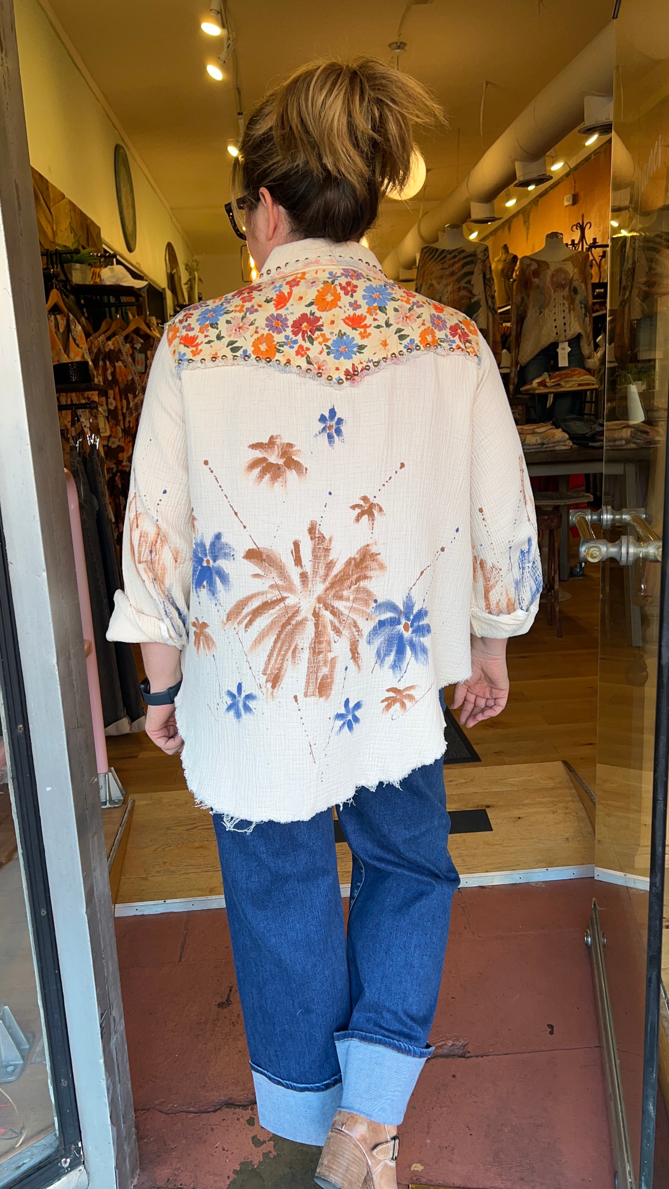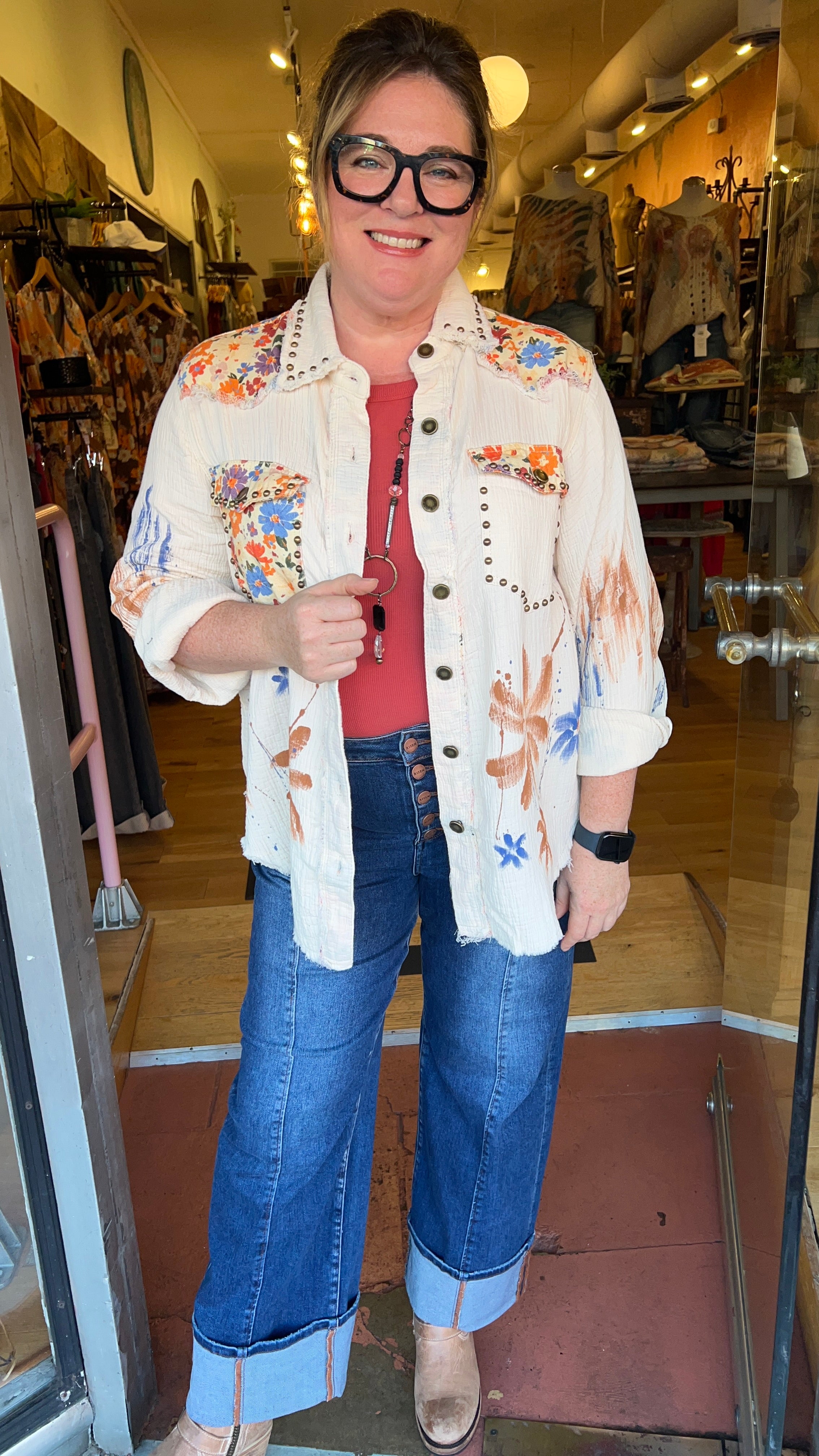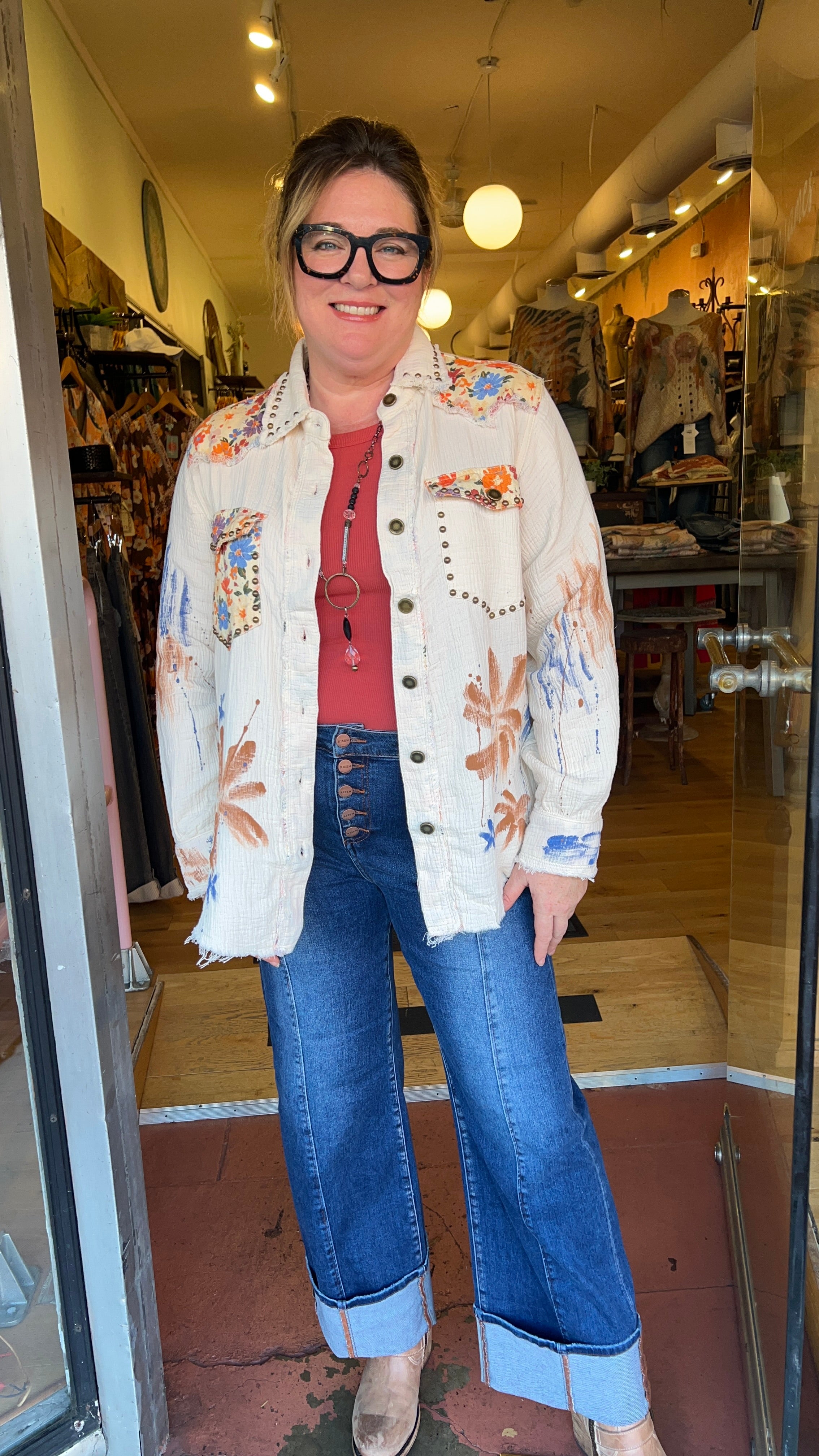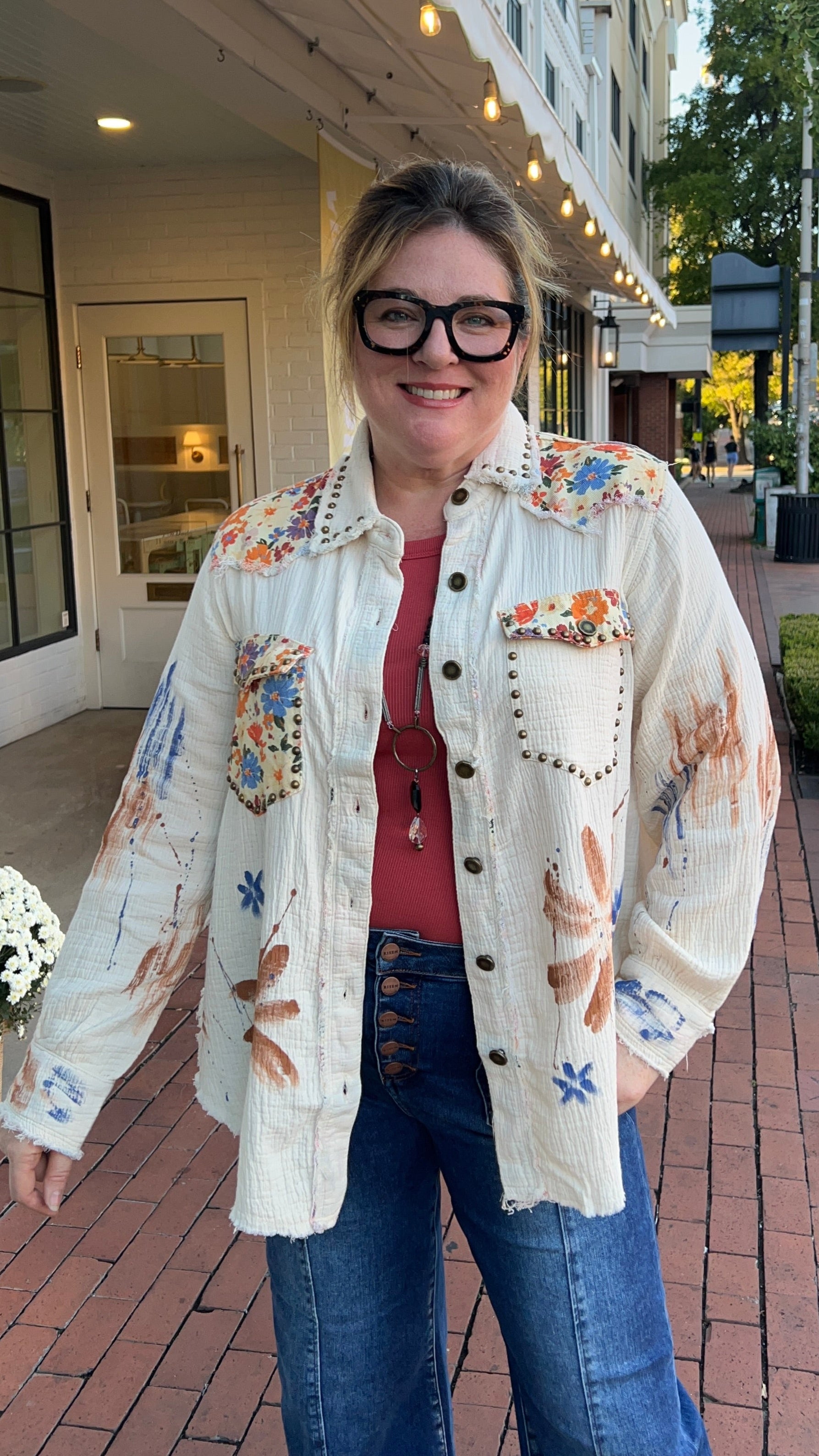 The Life Is Art Shirt Jacket is where creativity meets comfort — a statement piece that feels like wearable art. Crafted from soft cotton gauze, this cream shacket features hand-painted-style blue and brown paint splatters and fall floral denim accents on the shoulders and front pockets for that perfect mix of texture and whimsy.