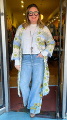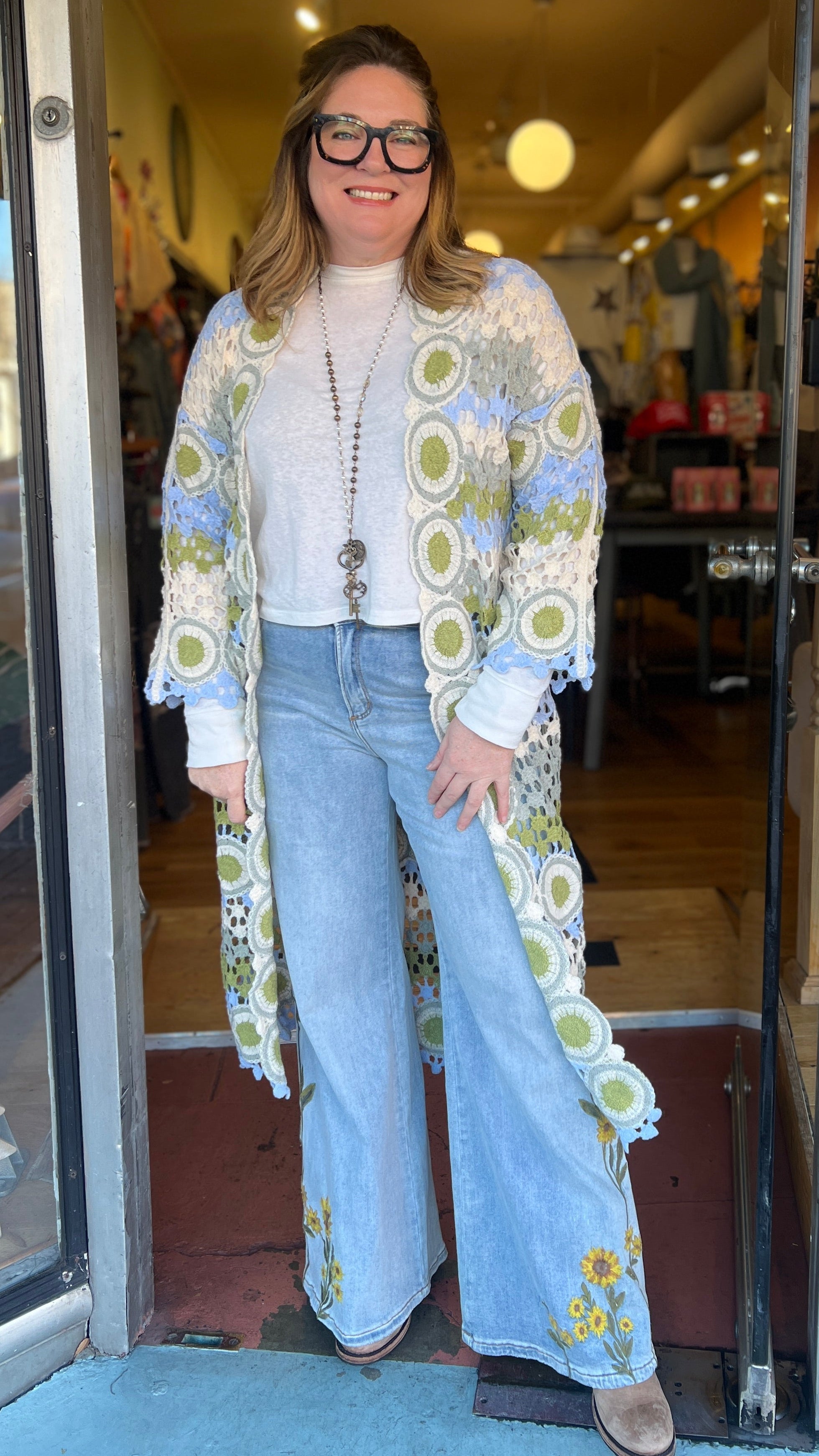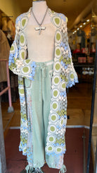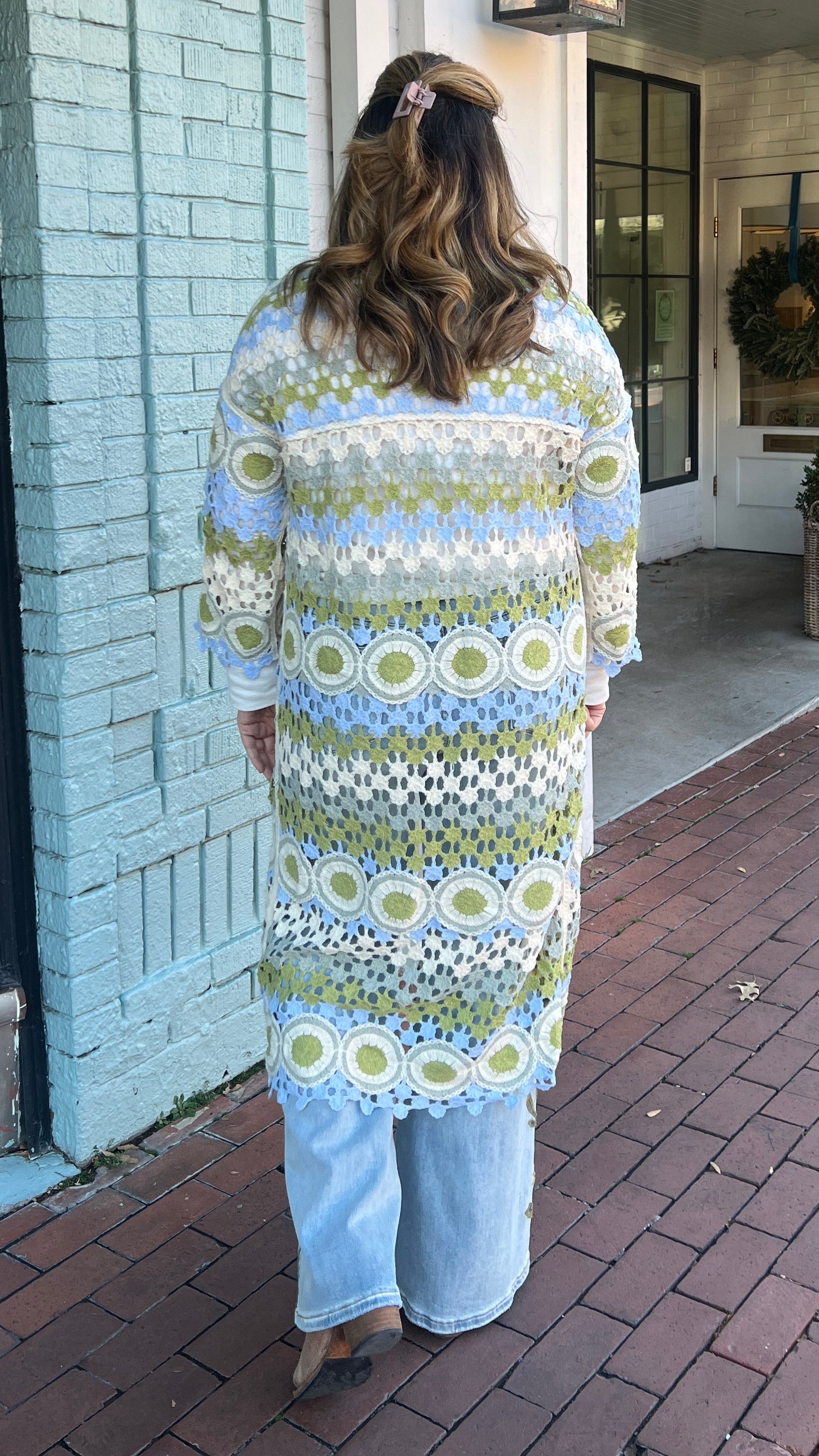 The Sky Blue & Green Crochet Sweater Duster is pure boho joy — light, colorful, and full of personality. Made from soft 100% acrylic yarn, this open-weave crochet duster features cheerful shades of sky blue, soft green, and creamy neutrals that instantly brighten any outfit.