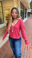 A timeless wardrobe staple with a feminine boho twist. This ribbed knit cotton top features delicate lace edges, metal flower buttons, and a contrast fabric seam down the back. Slim-fitting and flattering, it’s the perfect piece to style with jeans for casual days or layer under your favorite cardigans and jackets for fall. Also available in Black.