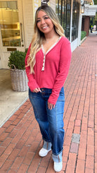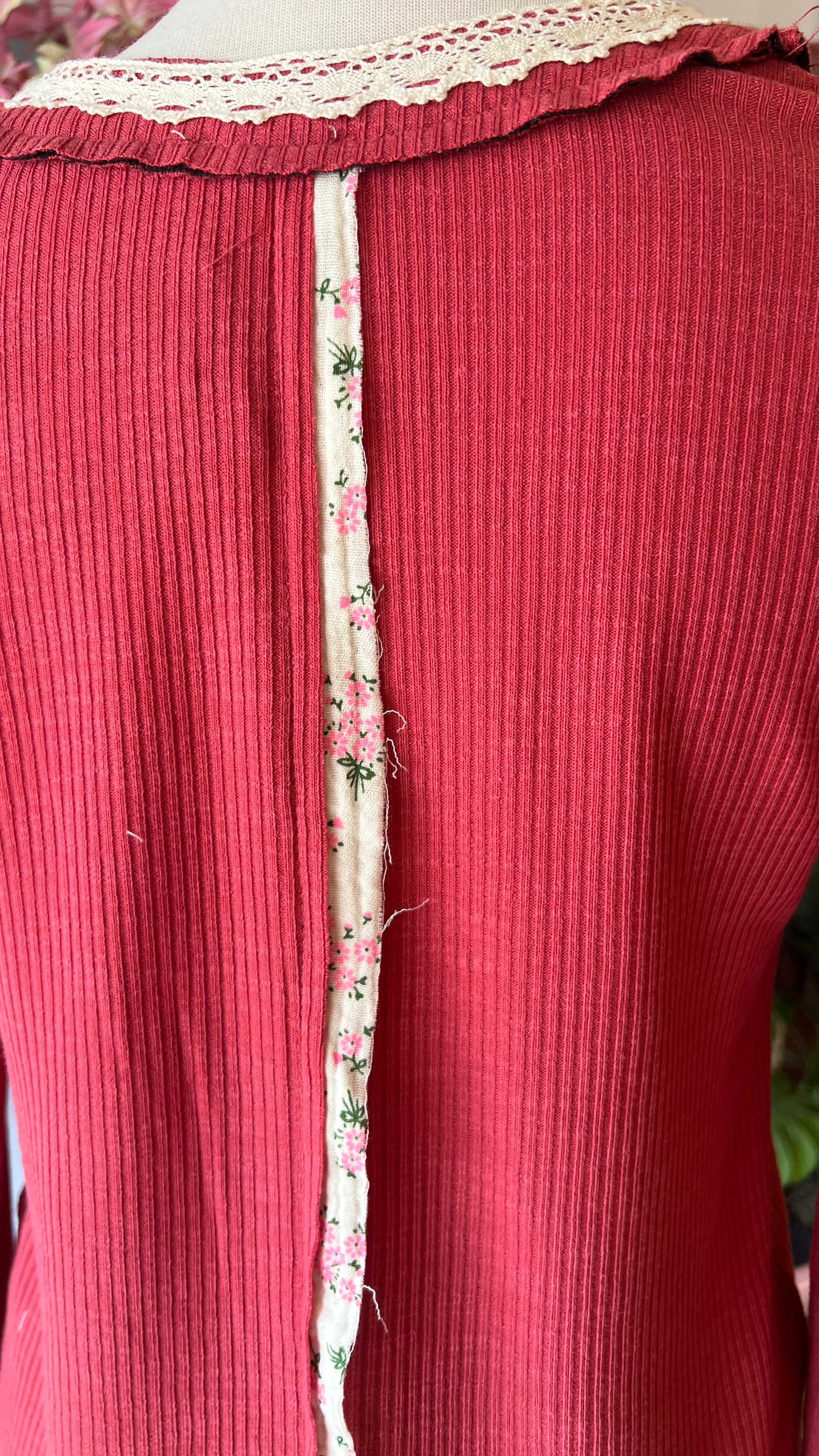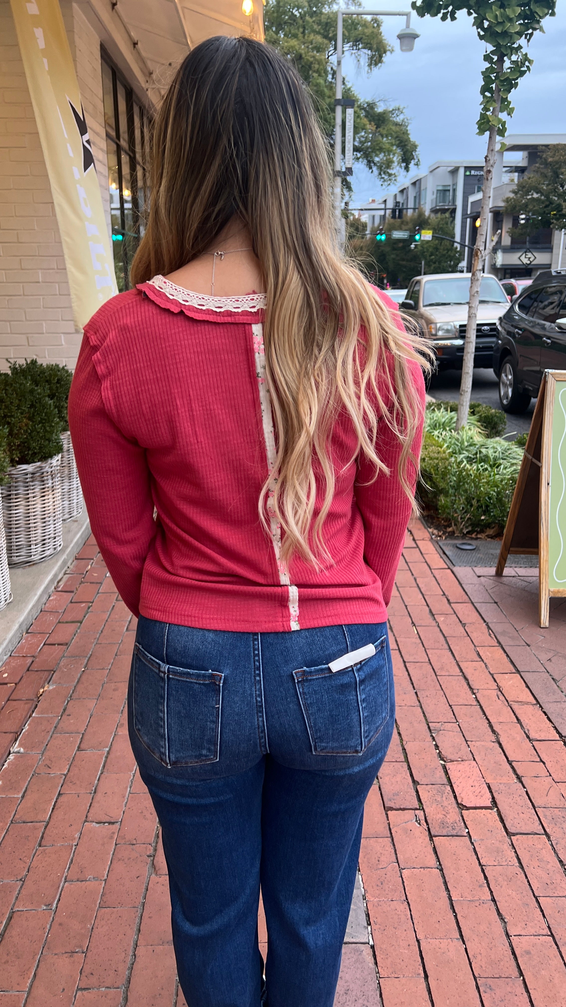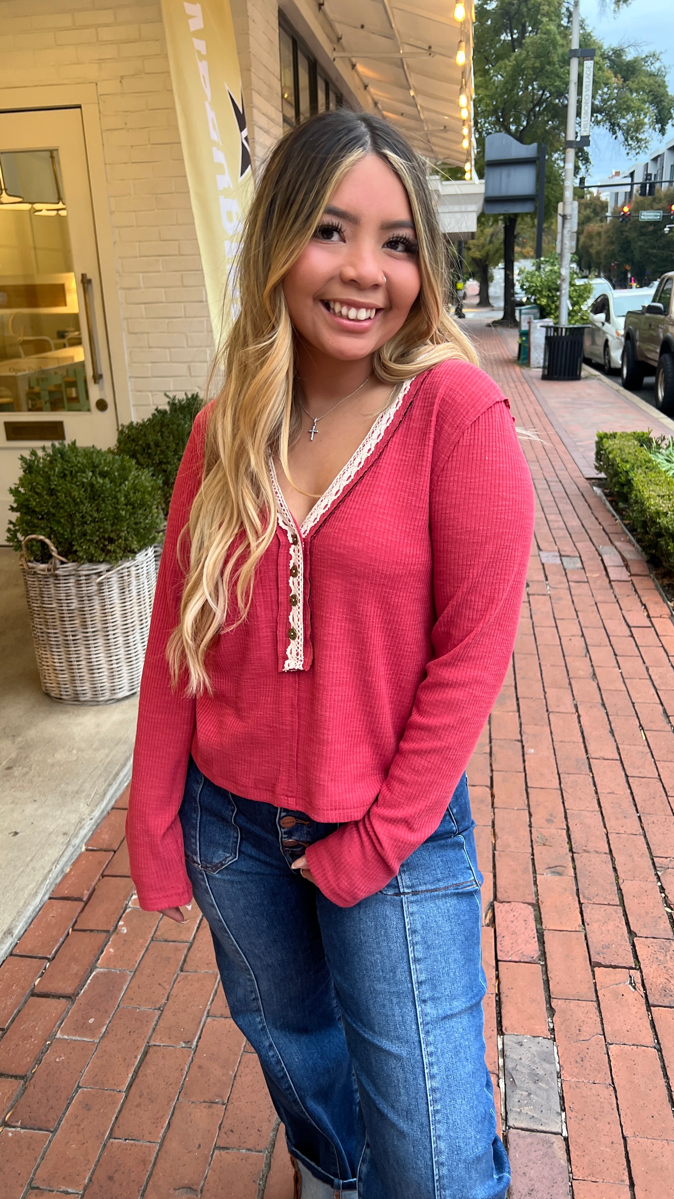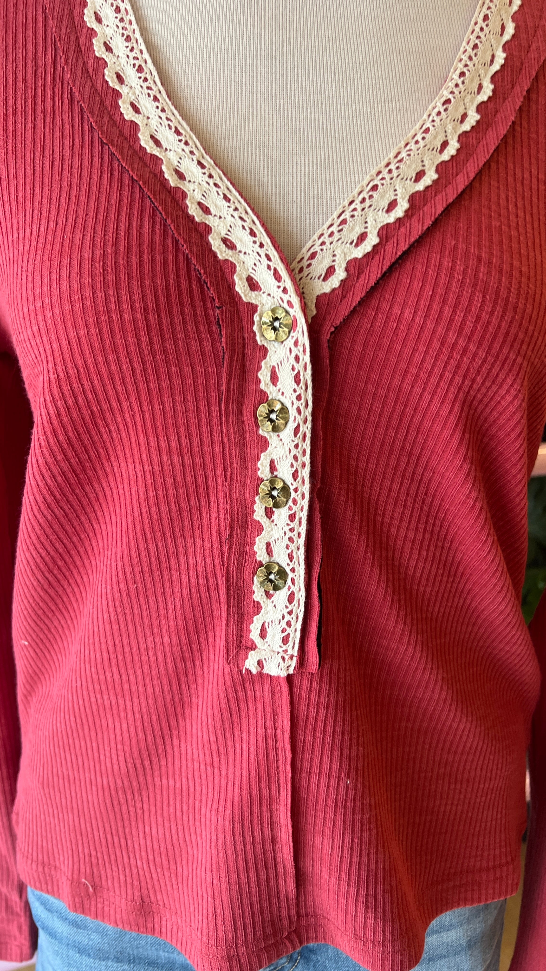 Cherry Rose Ribbed Knit Top with Lace Detail