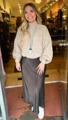 The Chocolate Brown Silk Satin Slip Skirt is the definition of timeless elegance with a touch of modern versatility. Its rich, silky sheen and fluid drape make it perfect for dressing up or down — pair it with our Chunky Oatmeal Sweater for a cozy-chic fall look, or add heels and jewelry for an effortlessly elevated evening style.