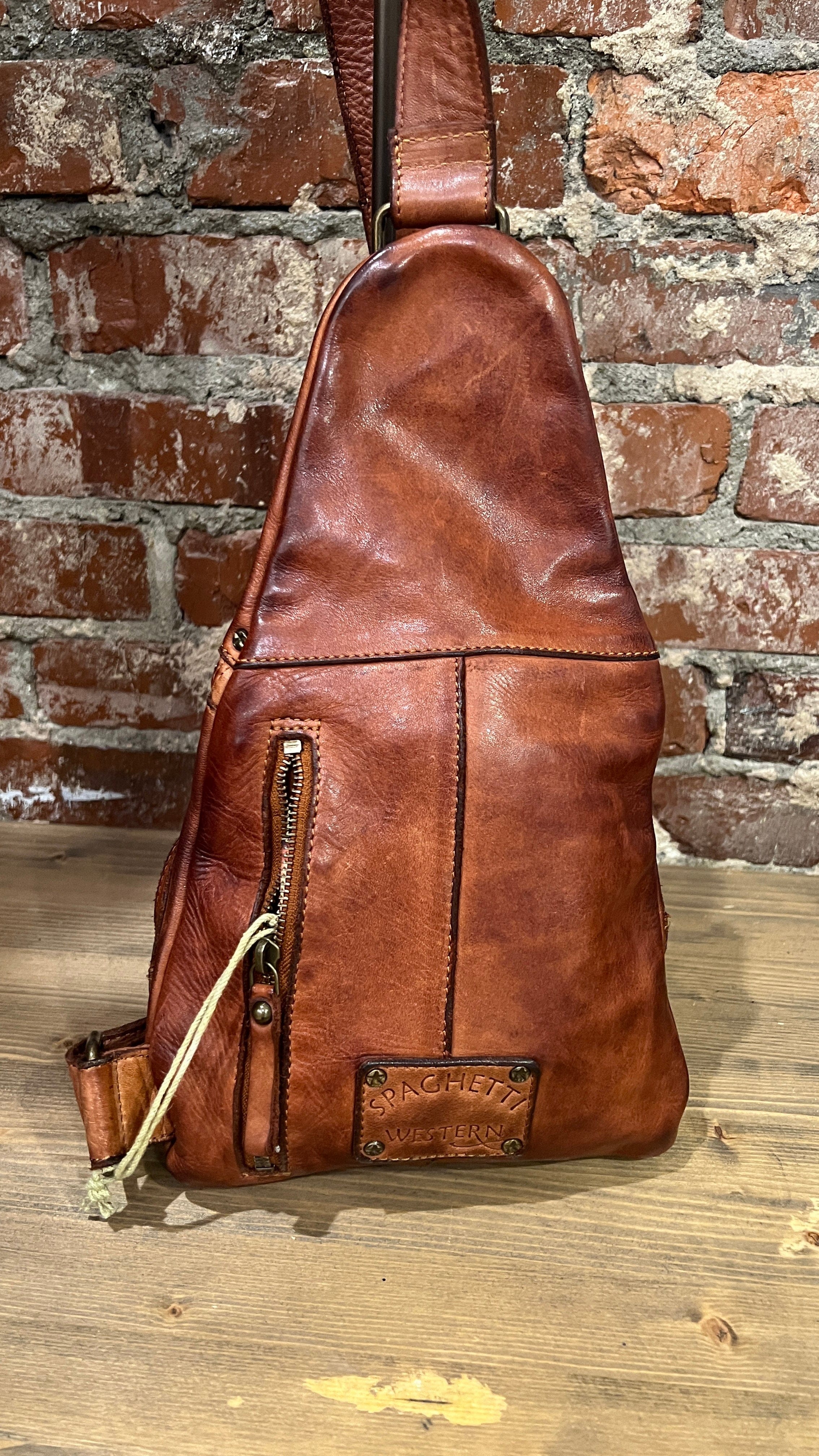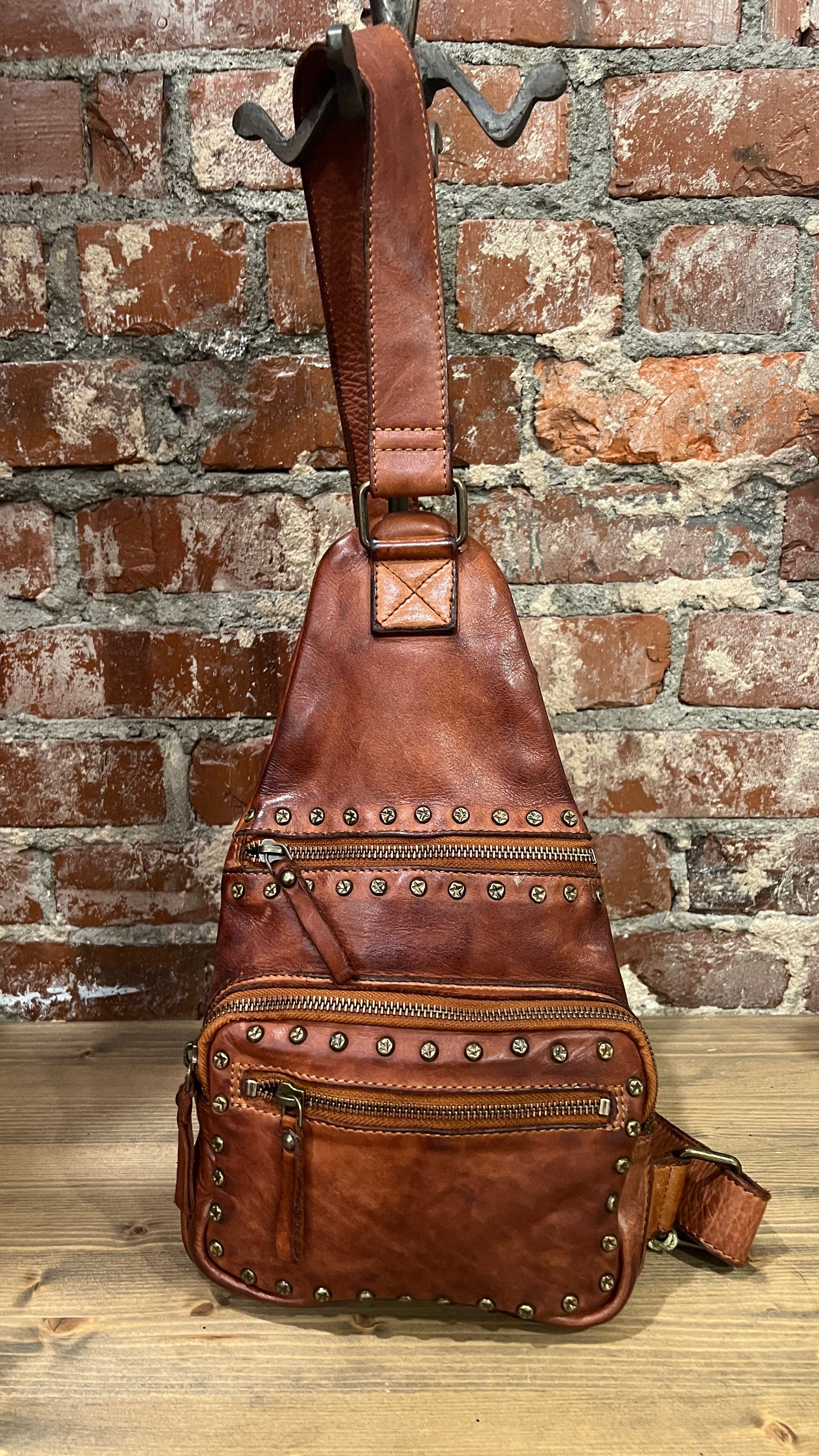 Cognac Italian Leather Studded Sling Bag