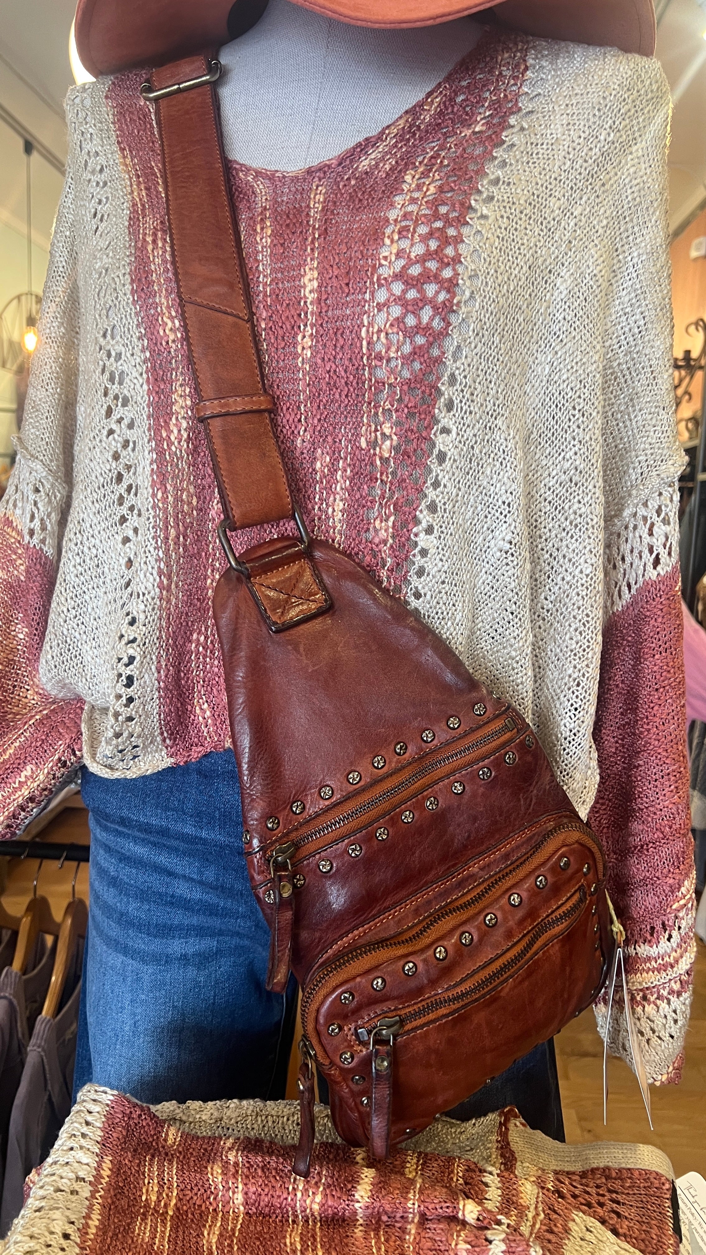 Indulge in luxury with our Cognac Italian Leather Studded Sling Bag. Designed to keep your essentials close to your body, this perfect bag allows you to go hands-free while exuding style and sophistication. Elevate your outfit and convenience with this exclusive and tasteful accessory.
