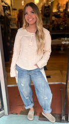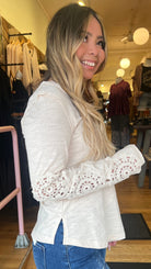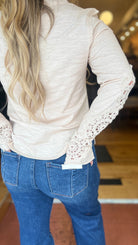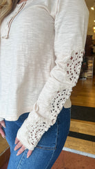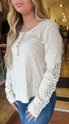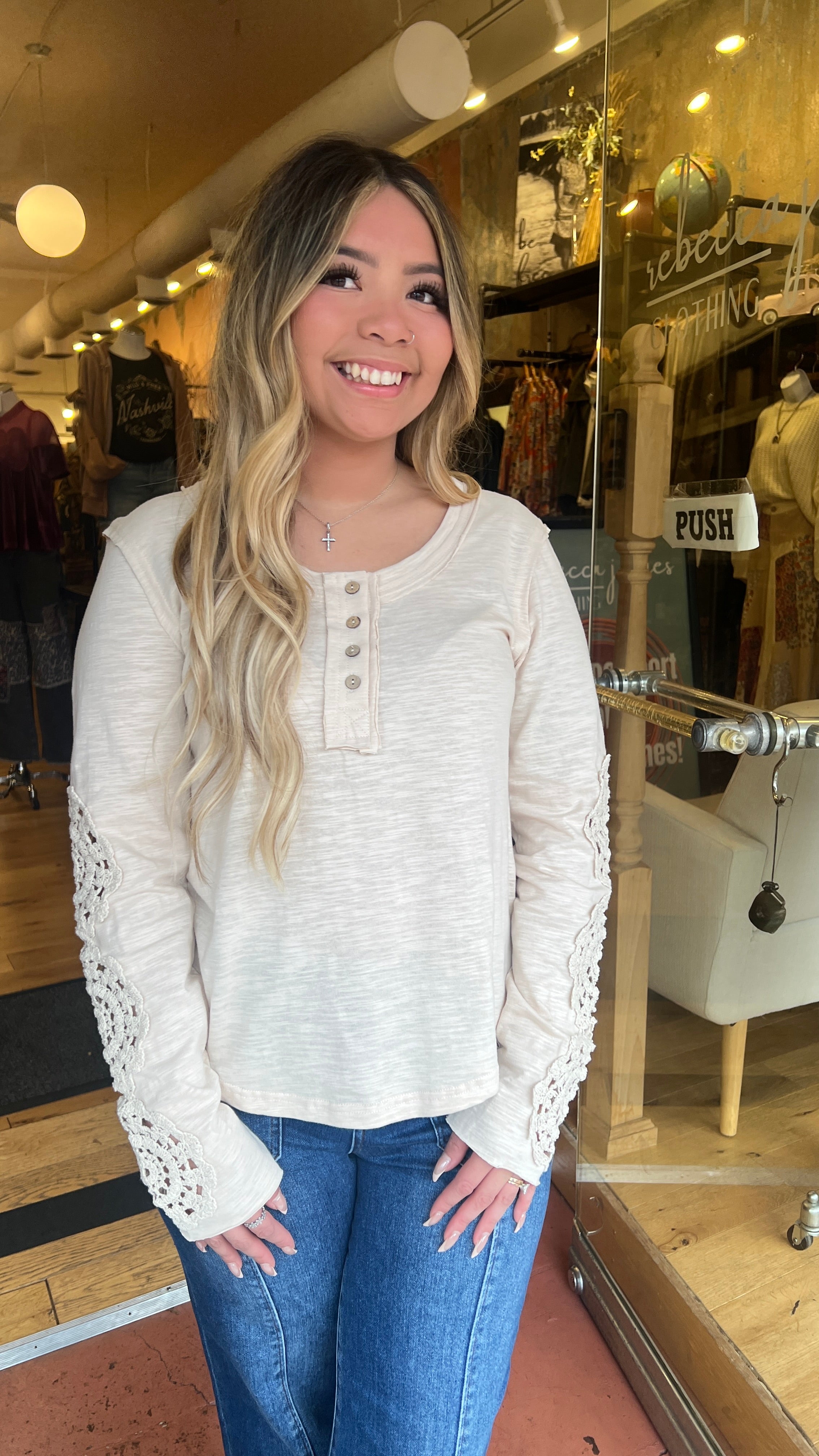 Cream Cotton Henley Top w/ Lace Inset Sleeves