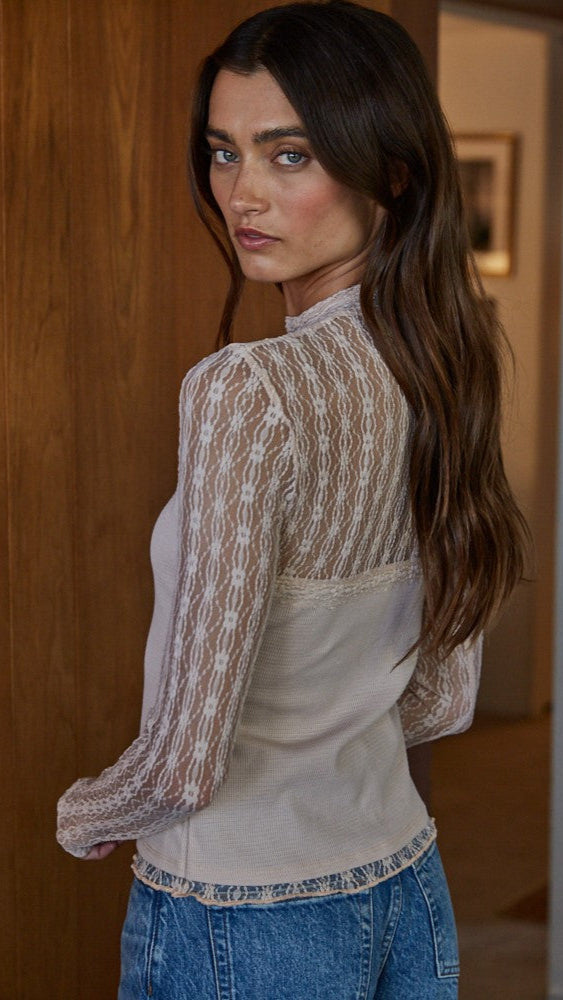 The perfect feminine layer for fall, this ribbed mock neck lace top adds instant elegance whether worn under blazers, paired with overalls, or styled on its own for date night. The fitted silhouette flatters while the sheer lace and ruffled sleeve detail give it a romantic, boho-inspired touch.
