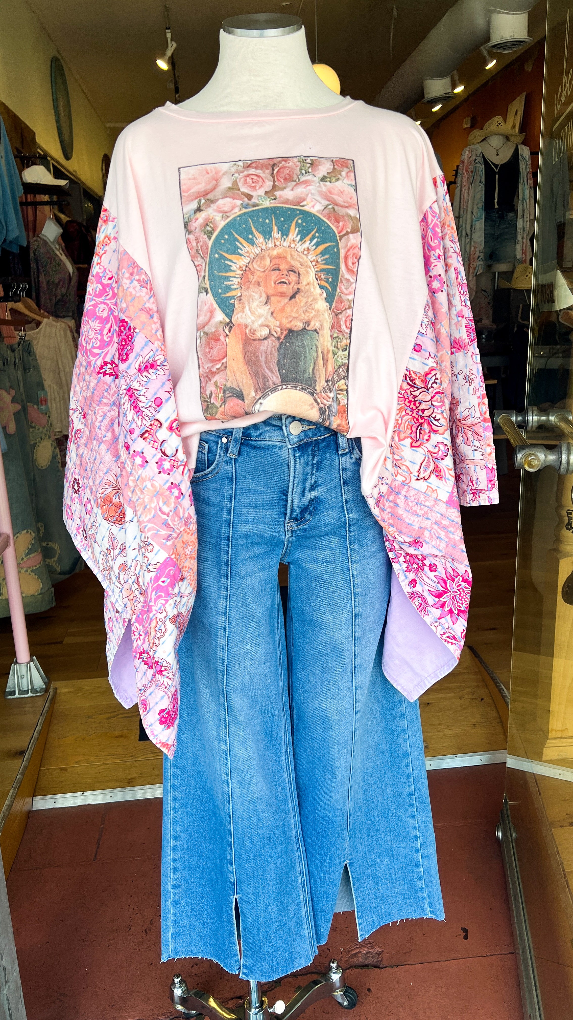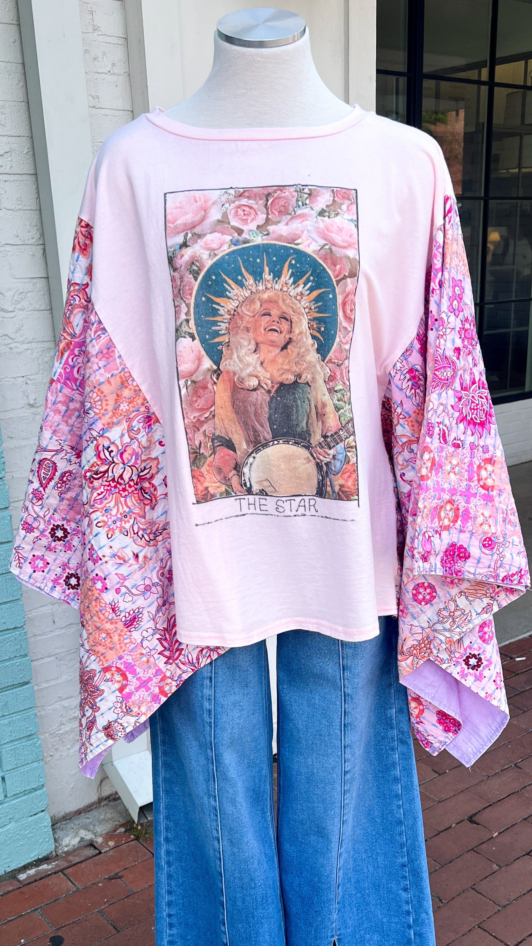 Get ready for a show-stopping piece that's as bold and free-spirited as Dolly herself! 🎤✨ Our Dolly The Star Patchwork Poncho Top takes the beloved graphic tee trend to the next level with mixed fabric patchwork sleeves, creating a loose, flowy poncho silhouette that's perfect for today's boho fashion lover.