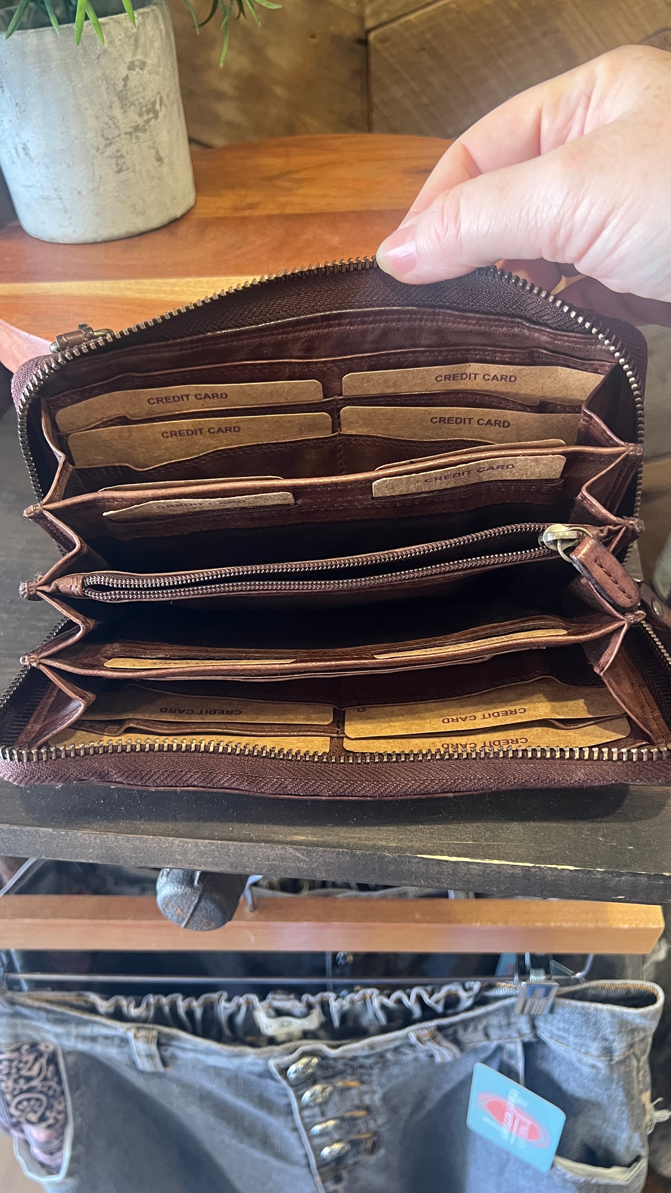 Zipper closure with zipper pocket inside. 17 card slots with a dedicated liscence holder. Stay organized with this fashionable bag.