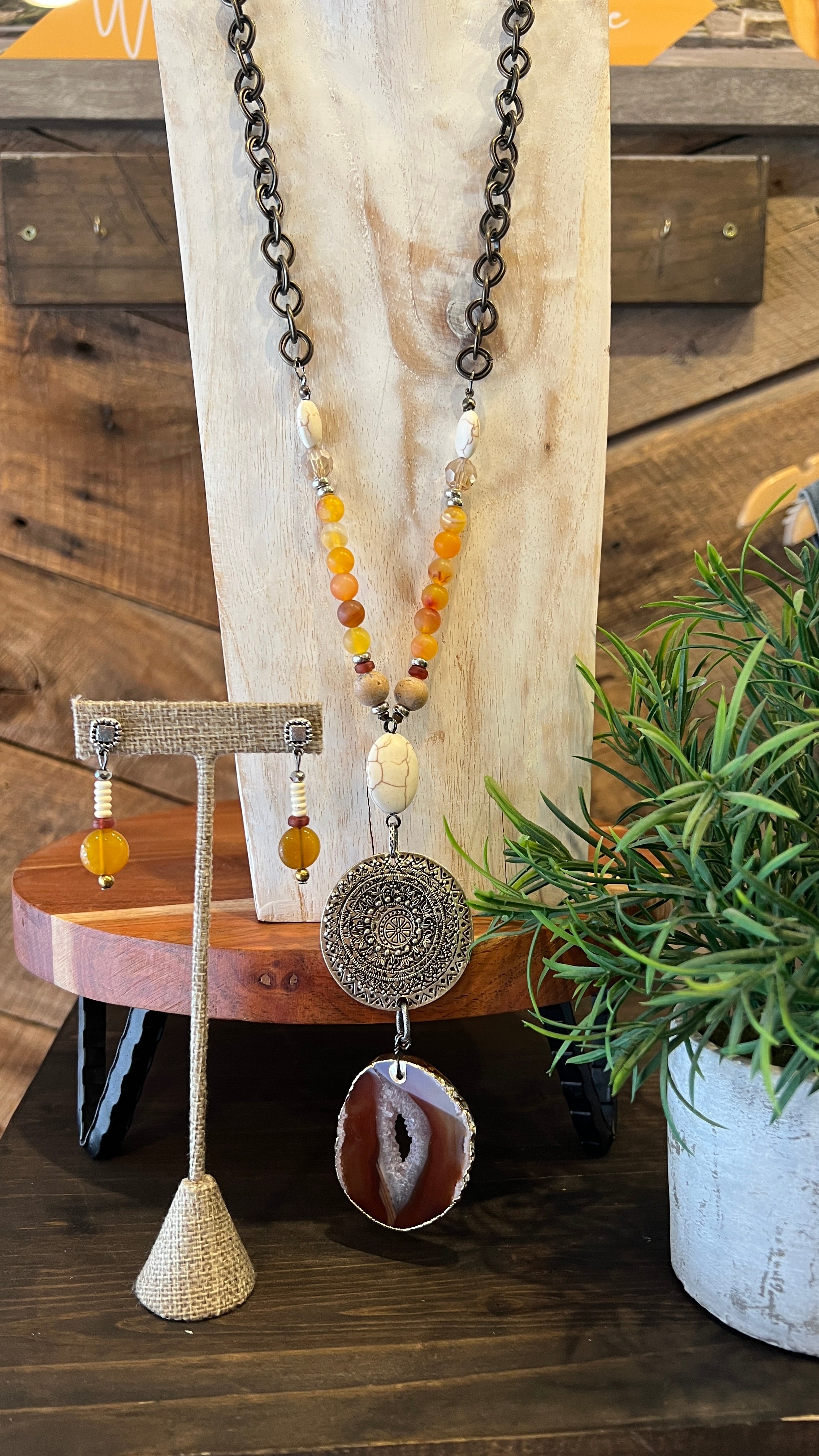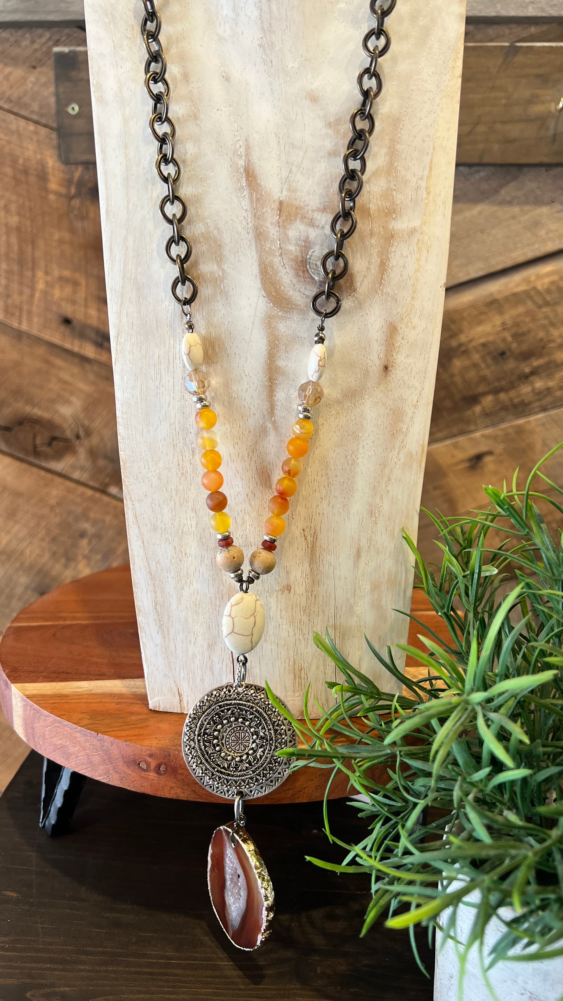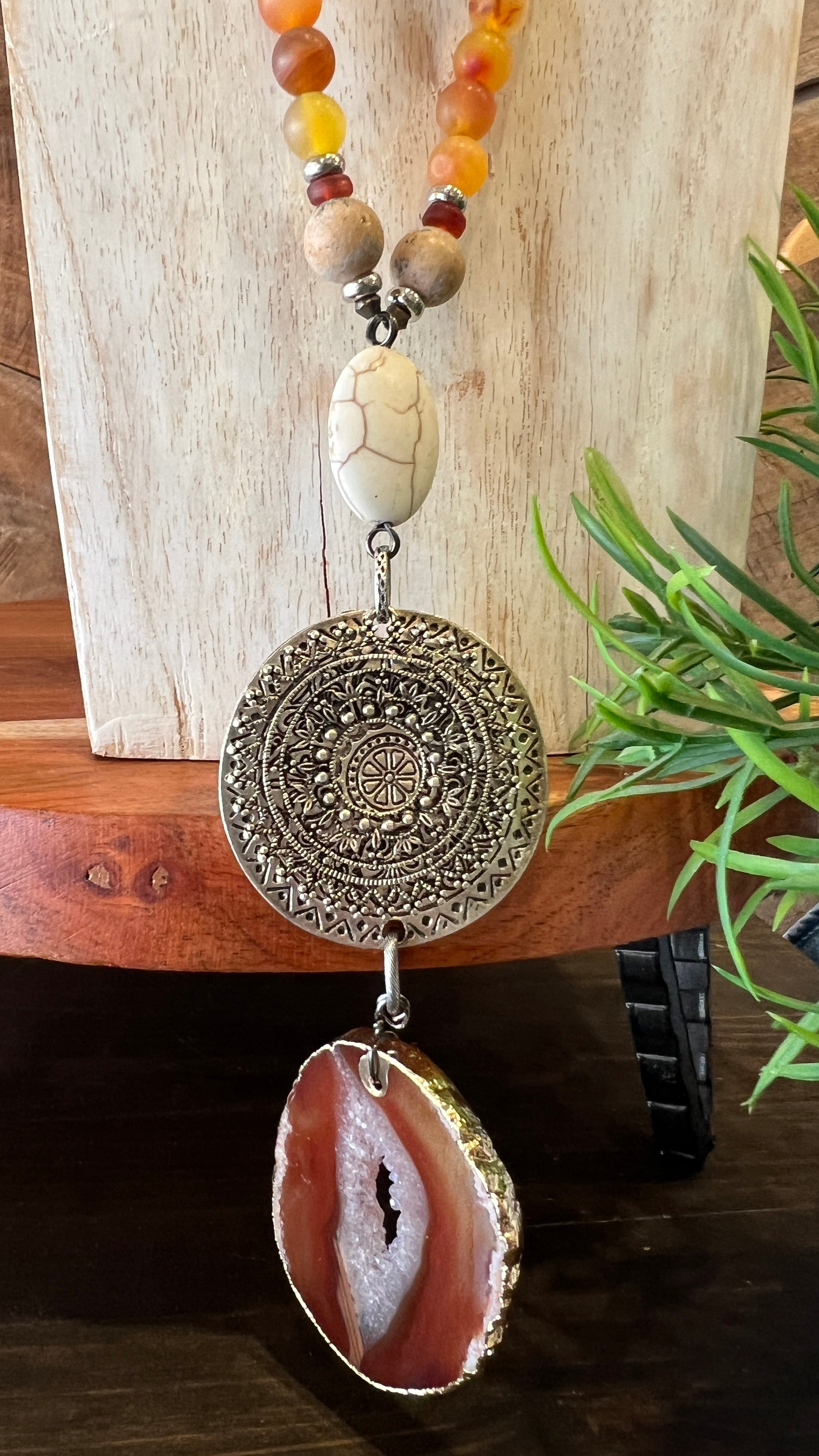 Long Beaded Necklace with Silver Pandant & Encrusted Agate