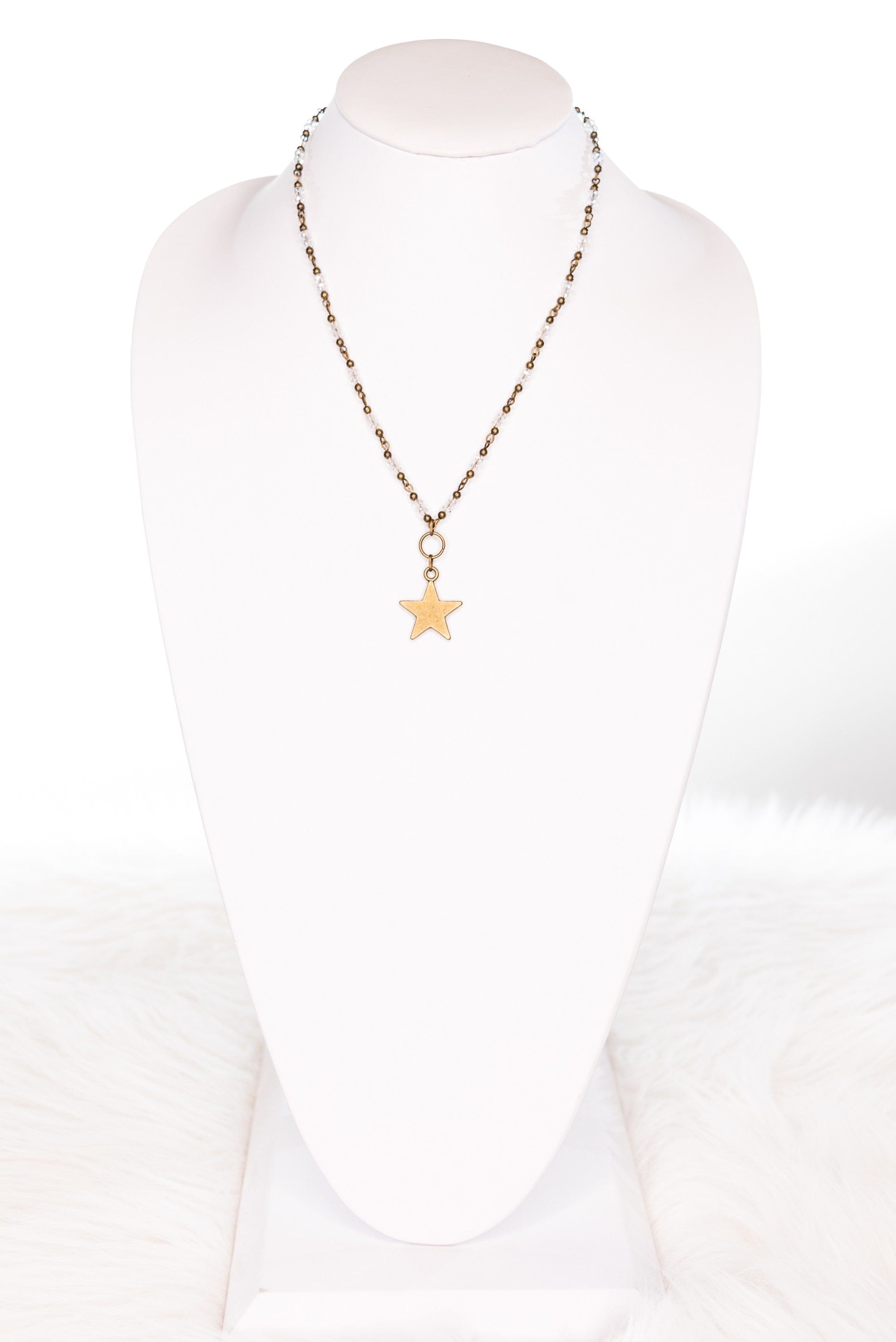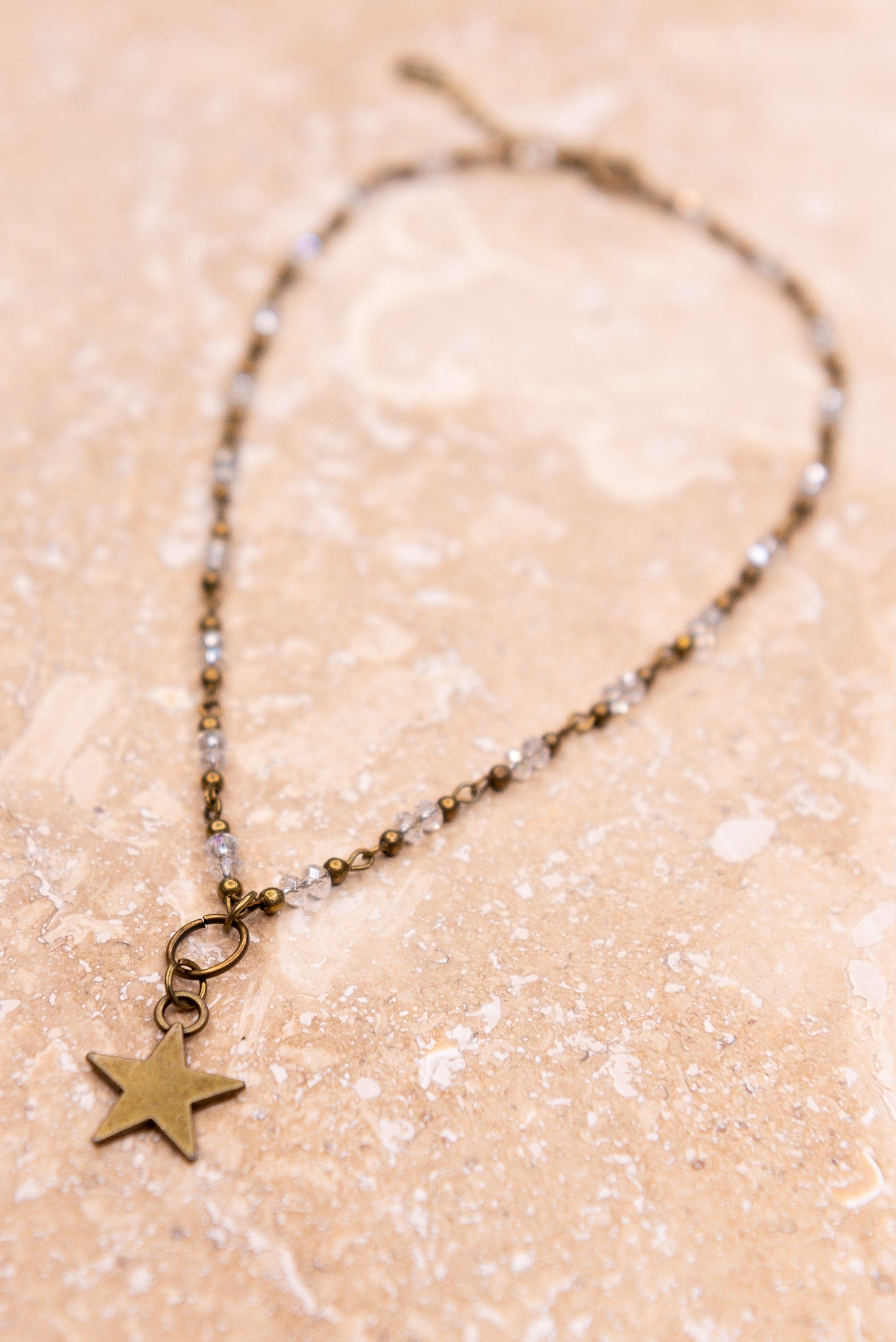 Shine bright with the Maddie Antique Gold Star Necklace, a delicate and versatile layering piece designed for effortless style. Featuring clear and antique gold beads, this short, adjustable beaded necklace is finished with a 1-inch antique gold star charm, adding a celestial touch to your jewelry collection.