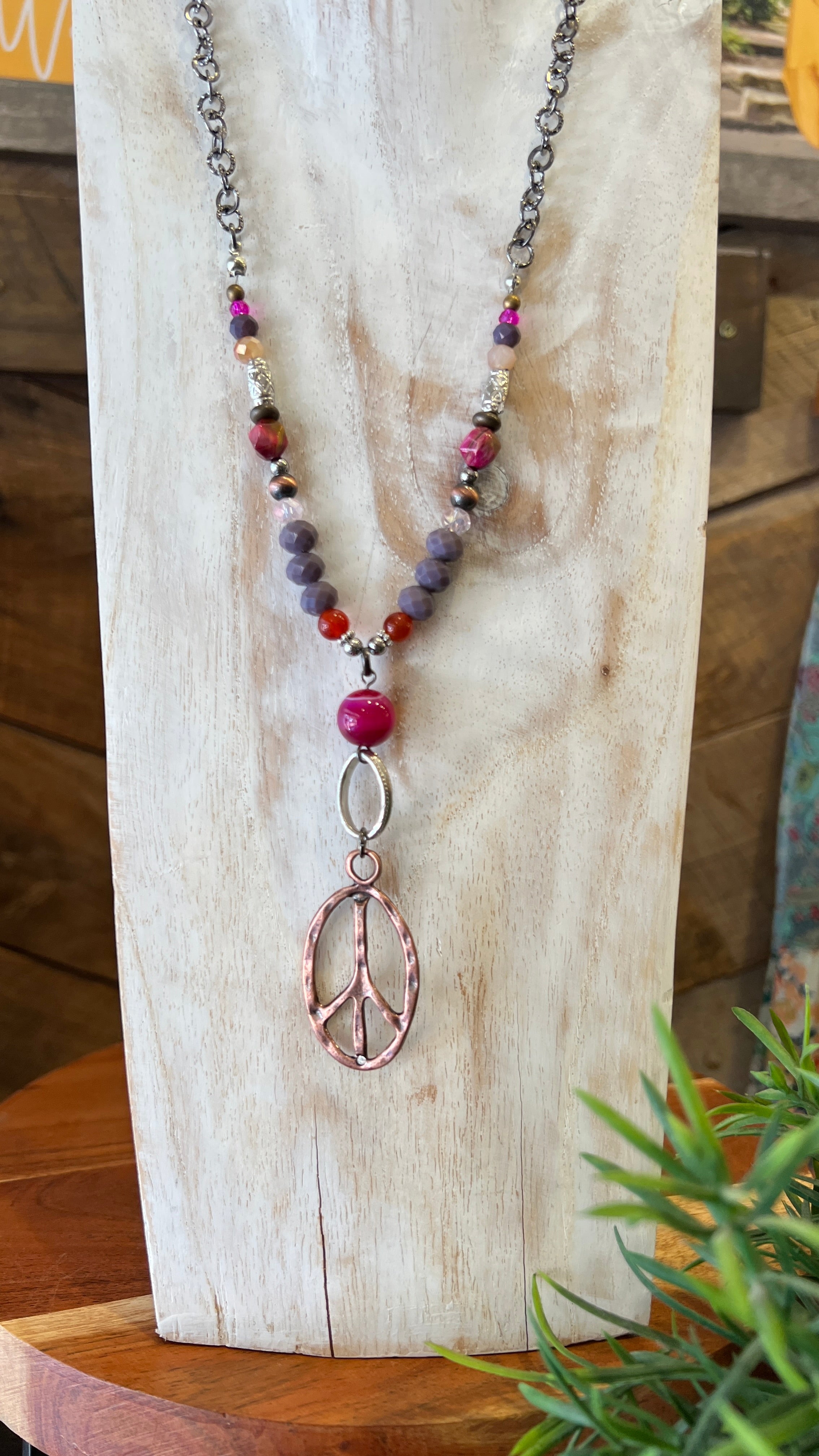 Copper Peace sign on a berry mixed color beaded necklace with a silver chain. - layers great with all of our berry crimson necklaces.