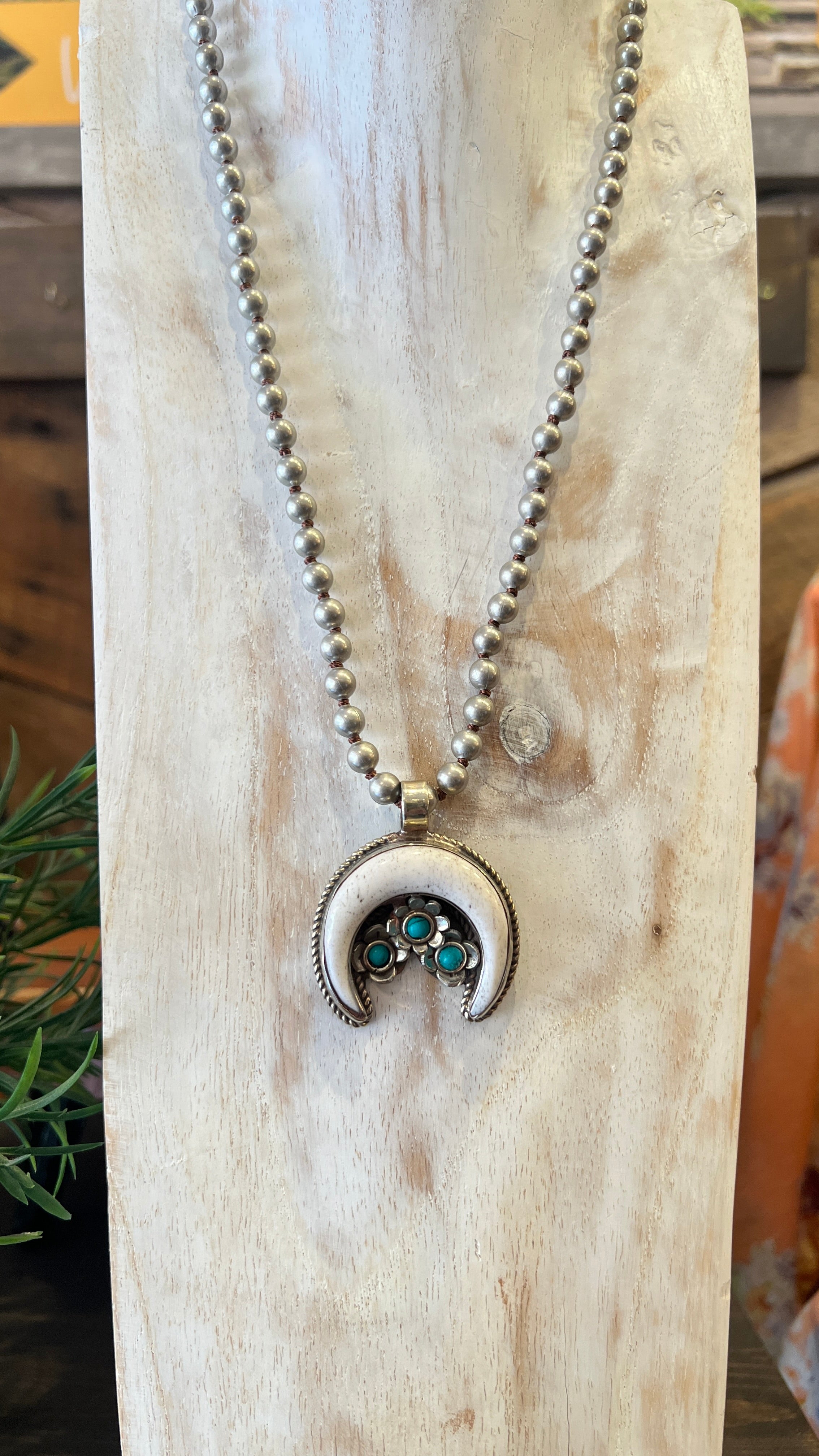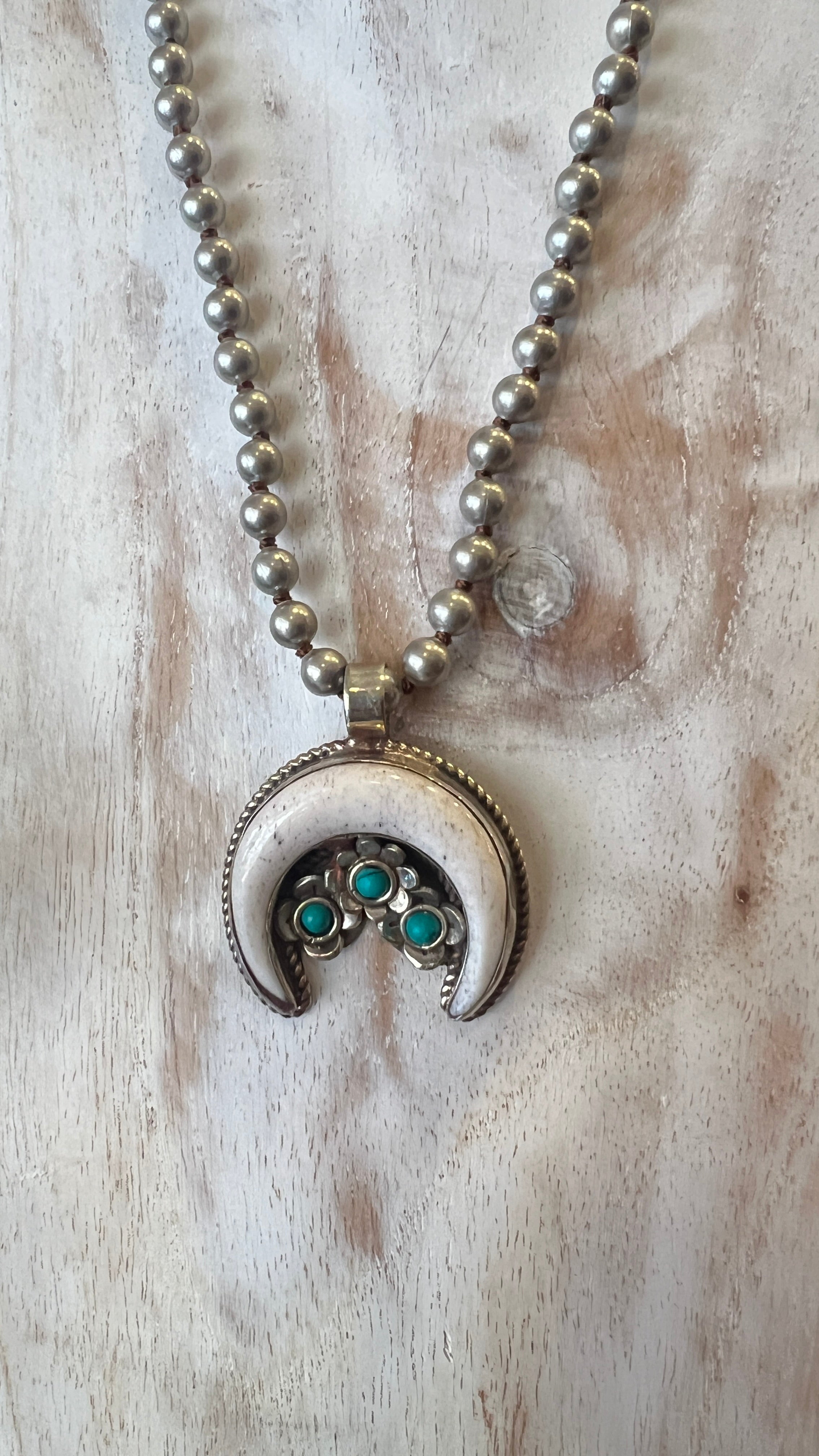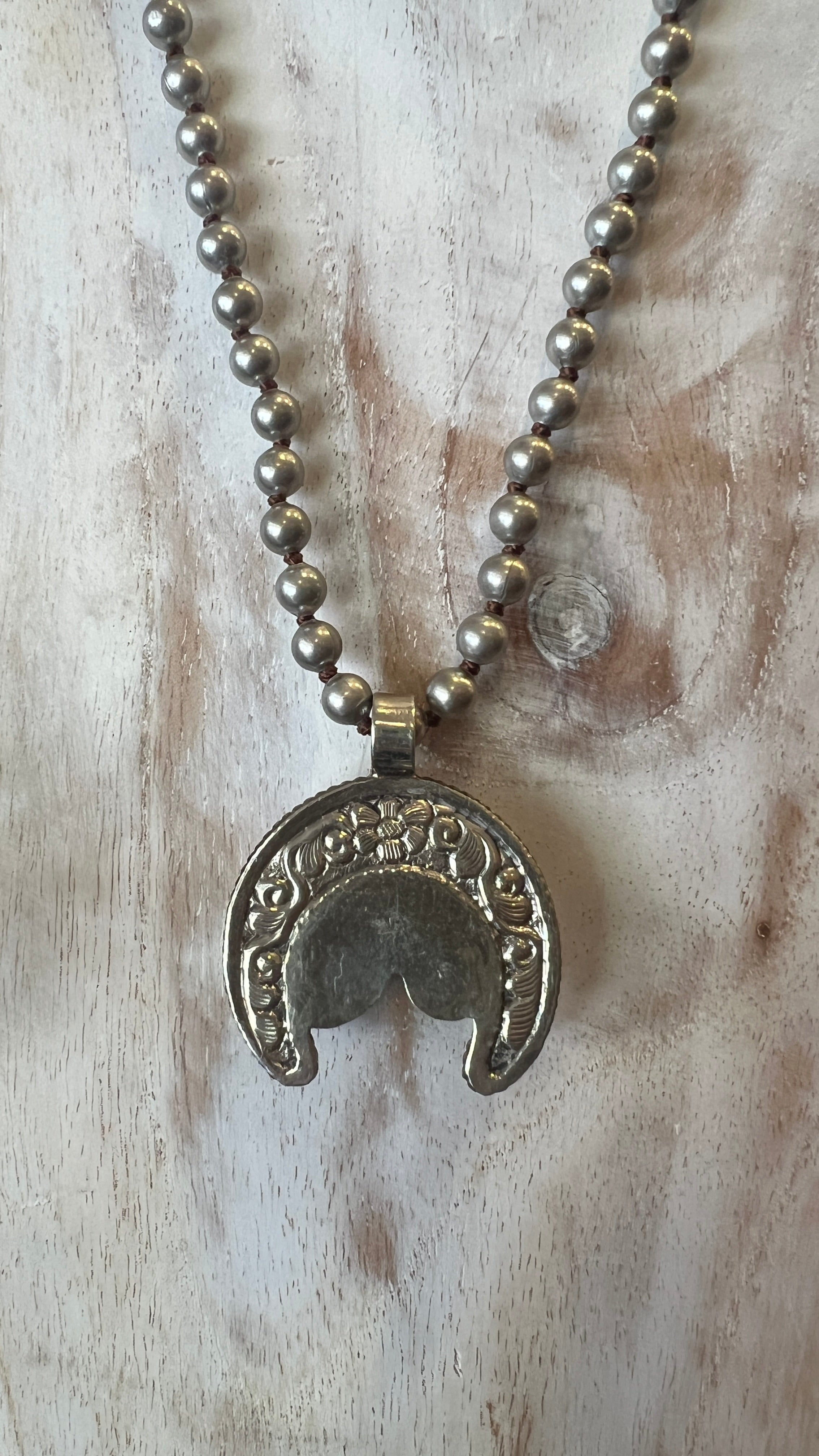 Moon Flower Encased in Tibetan Silver on Hand Beaded Necklace