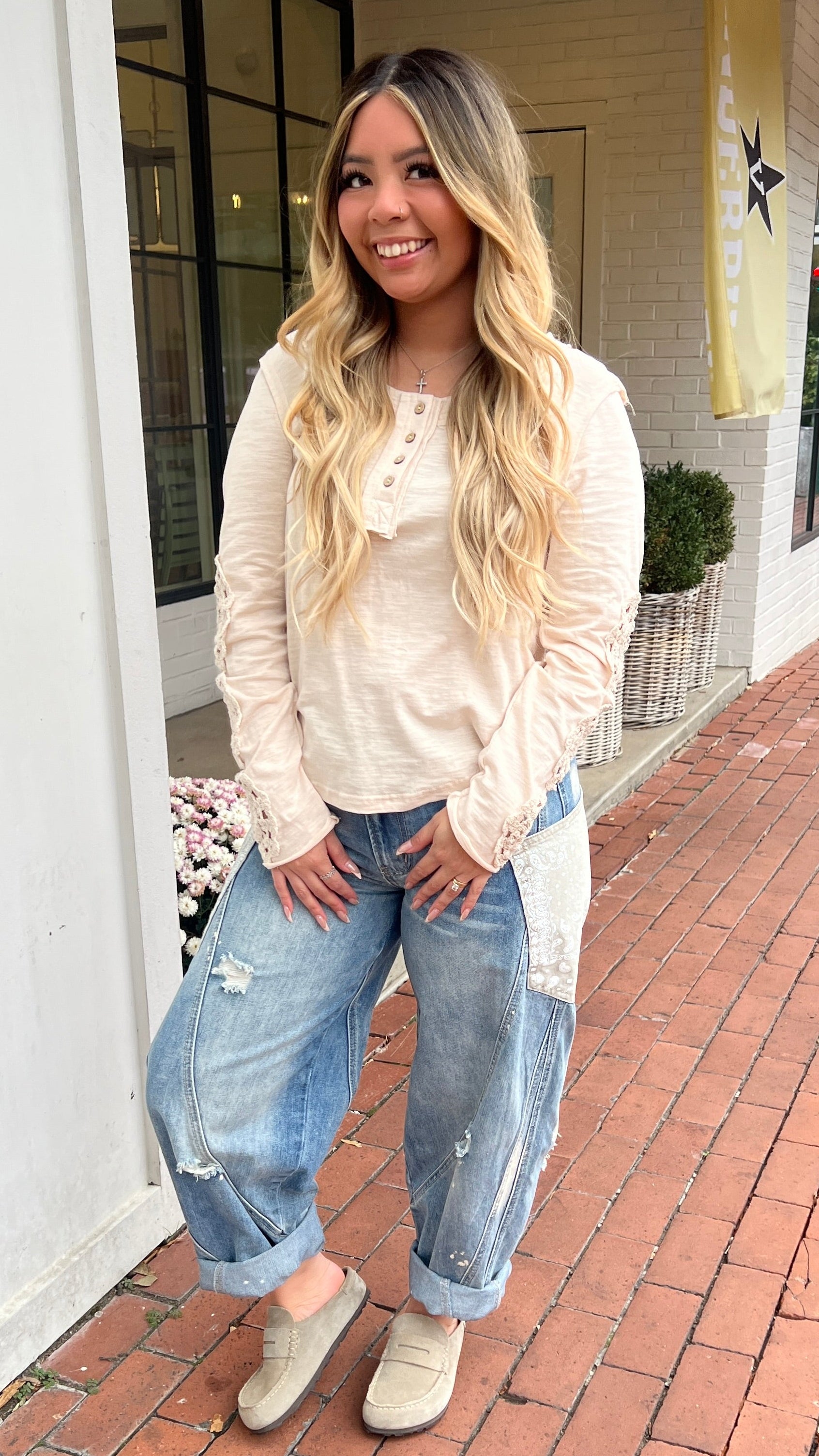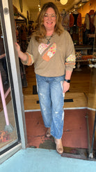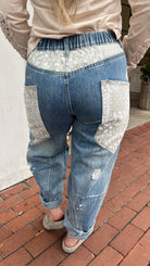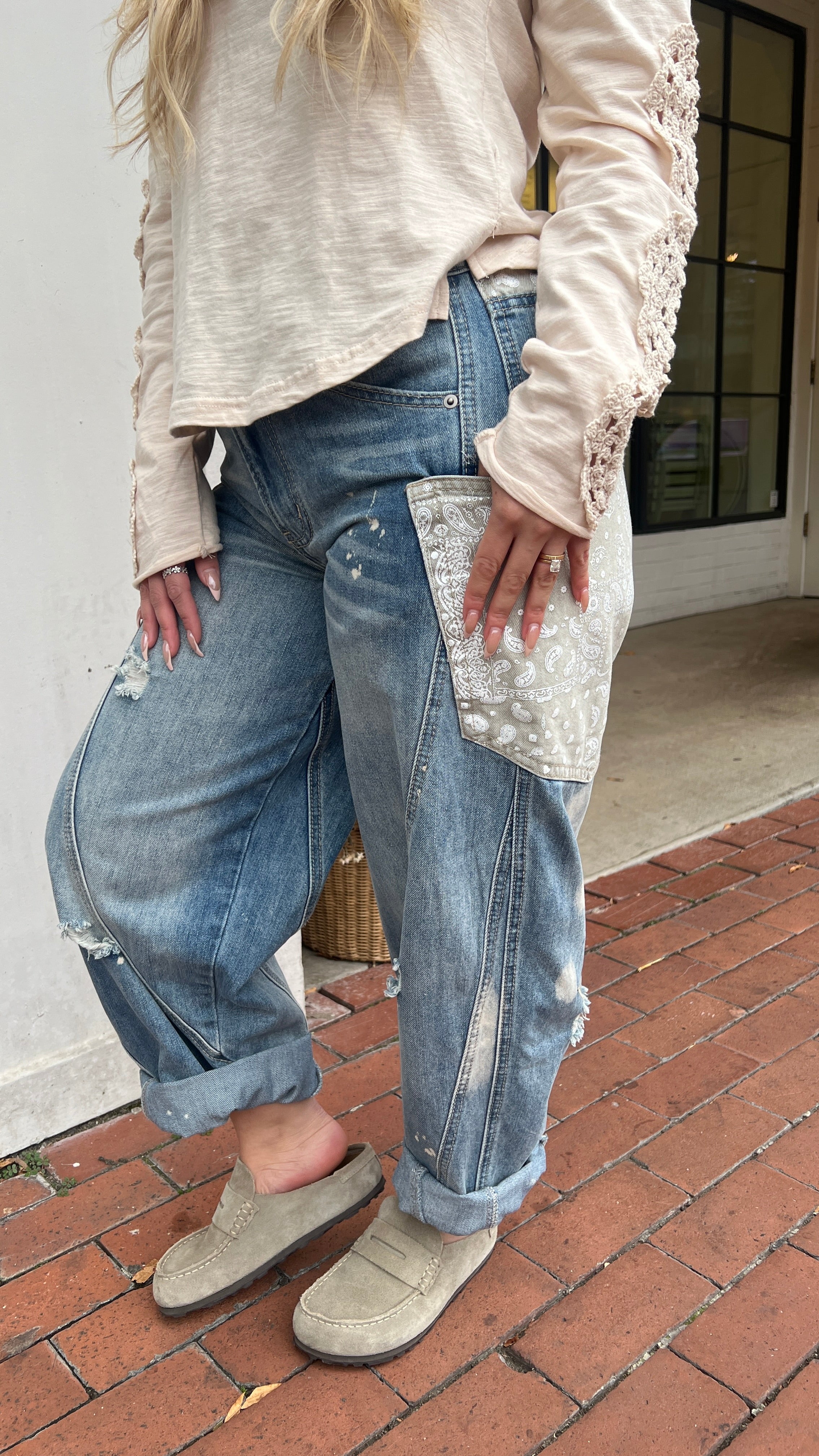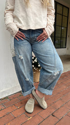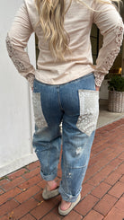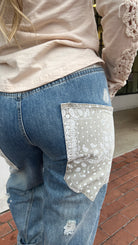A fresh take on boho denim—these relaxed barrel jeans feature standout oversized bandana print pockets, subtle distressing, and bleach-spot details for a lived-in vibe. Designed with unique seaming for a flattering fit, they balance comfort and style with an elastic back waistband. Perfect for weekend outings, concerts, or travel days when you want denim that stands out from the rest.
