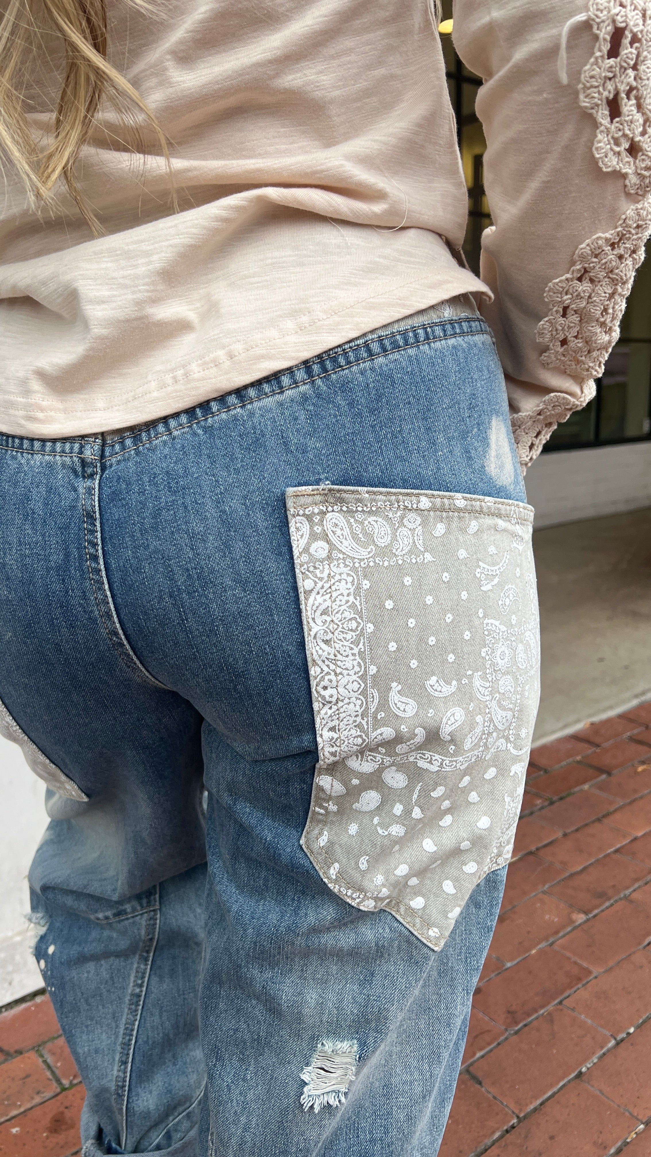 Relaxed Barrel Jeans with Oversized Bandana Print Pockets – by Oli & Hali