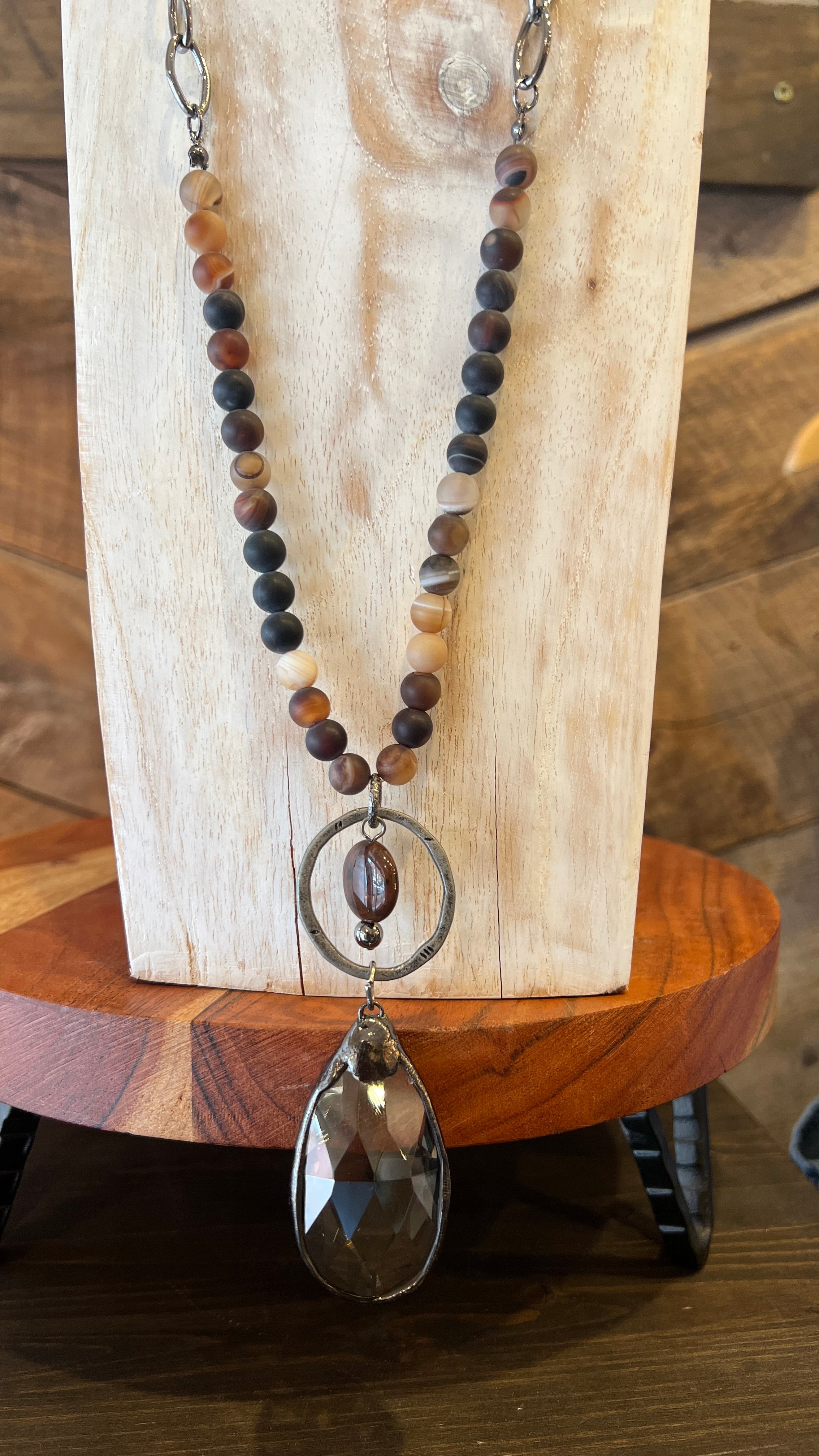 Silver Chain & Earth Tone Beaded Necklace with Rustic Crystal Drop