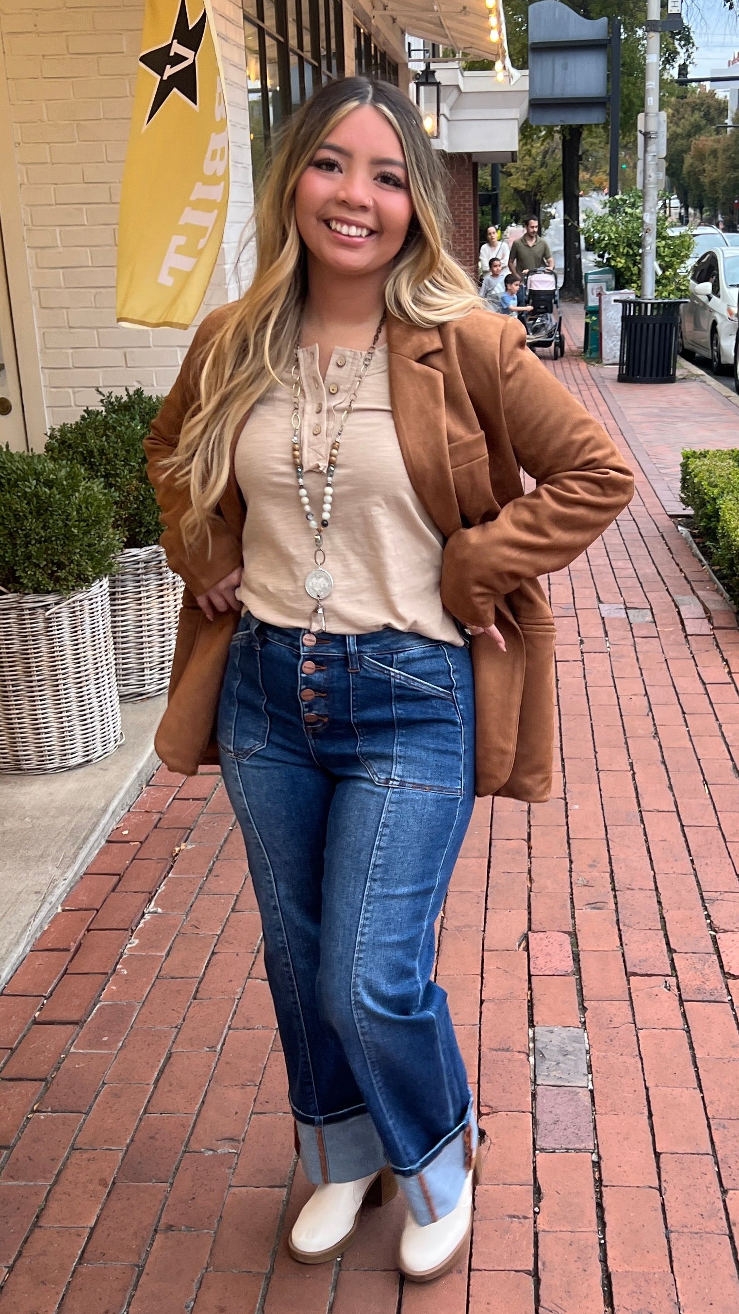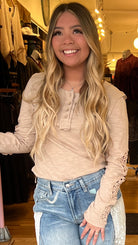 The Tan Cotton Henley Top with Lace Inset Sleeves is a fall favorite that blends casual comfort with feminine detail. Made from 100% cotton in a soft neutral tan tone, this slim-fit top features functional buttons at the neckline and delicate lace insets running down the sleeves from elbow to wrist — adding just the right touch of texture and charm.